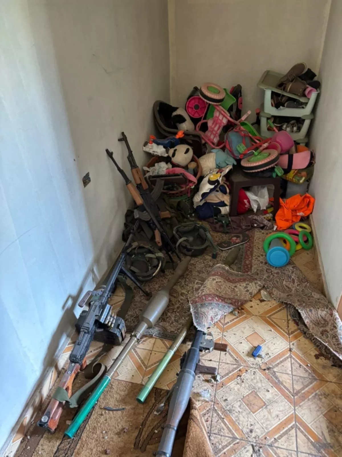«В ходе целевого рейда сил в районе Адшит аль-Кусейр был обнаружен склад, в котором большое количество вооружения находилось прямо в детской комнате. Среди обнаруженного оружия: взрывные устройства, автоматы типа “Калашников”, гранаты, реактивные снаряды RPG, пулемёты, боеприпасы и другое военное снаряжение.