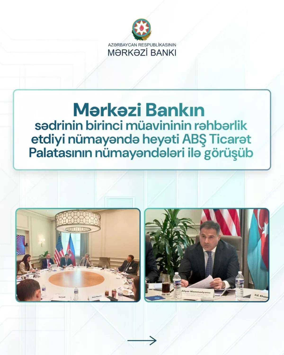 Первый зампредседателя Центрального банка Азербайджана Алияр Маммедьяров в рамках своего рабочего визита в Вашингтон провел встречу с представителями Торговой палаты США.