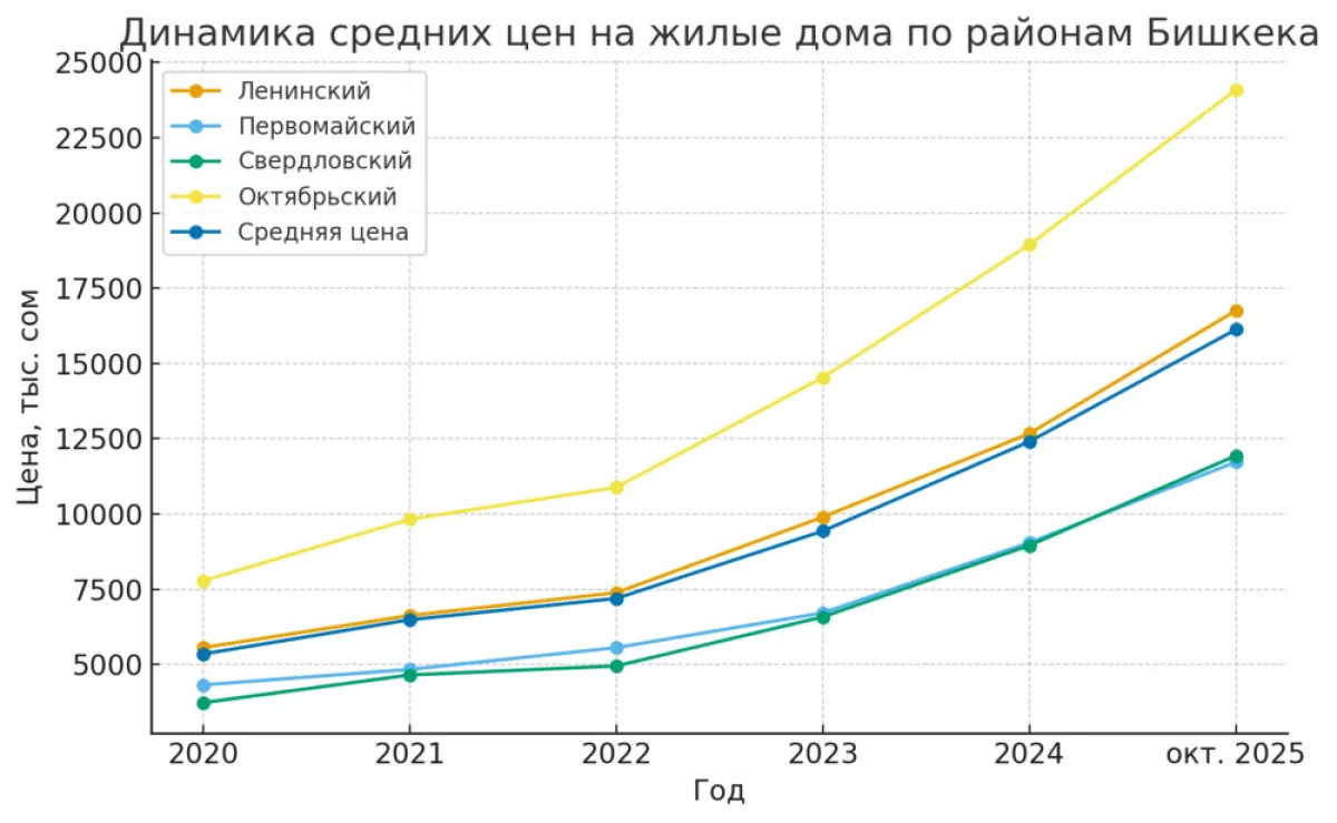 В целом структура рынка остаётся прежней: Октябрьский и Ленинский районы формируют верхний ценовой сегмент, тогда как Первомайский и Свердловский остаются относительно более доступными, но быстро догоняют лидеров по темпам роста. Такая динамика говорит о сохраняющемся высоком спросе на индивидуальное жильё во всех частях города и о продолжающемся удорожании земельных участков и строительства в Бишкеке.
