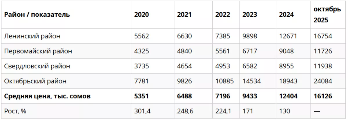 Наиболее дорогим остаётся Октябрьский район. Здесь средняя цена дома увеличилась с 7,78 млн сомов (≈147,8 тыс. манатов) в 2020 году до 24,08 млн сомов (≈457,5 тыс. манатов) в октябре 2025-го. Ленинский район также входит в число лидеров по уровню цен: показатель поднялся с 5,56 млн сомов (≈105,6 тыс. манатов) до 16,75 млн сомов (≈318,3 тыс. манатов).