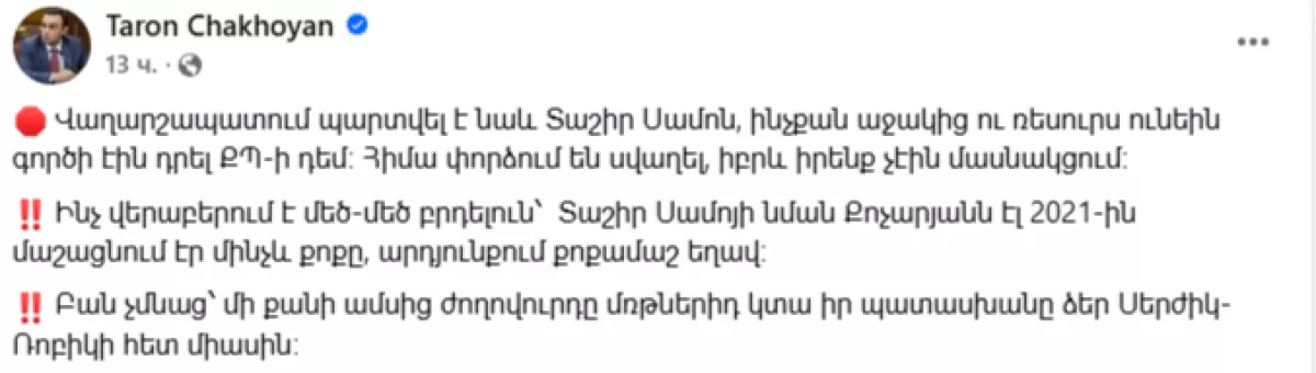 «В Вагаршапате проиграл также и Ташир Само (российский олигарх Самвел Карапетян — ред.) — сколько сторонников и ресурсов у них было, всё бросили против ГД (правящая партия «Гражданский договор» — ред.).