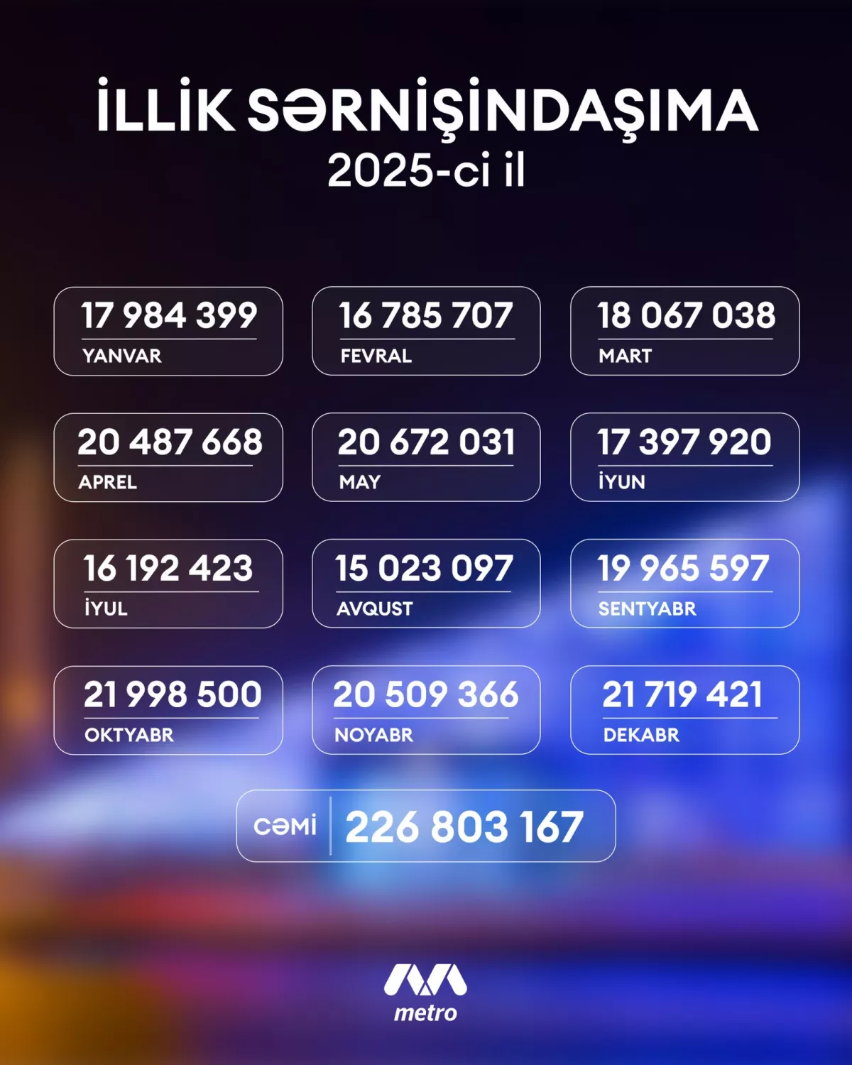 Как сообщил Caliber.Az начальник отдела по связям с общественностью Бакинского метрополитена Бахтияр Мамедов, всего в прошлом году перевезено 226 миллионов 803 тысячи 167 пассажиров (на почти 3 миллиона меньше, чем в 2024 году – тогда перевезли 229 миллионов 584 тысячи 259 пассажиров).