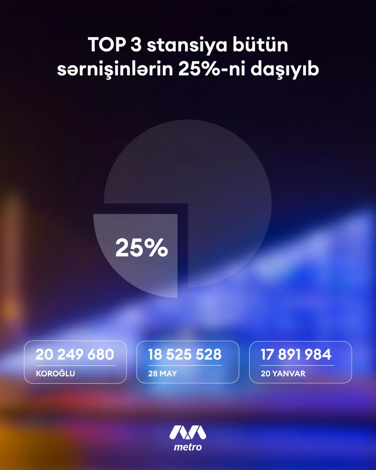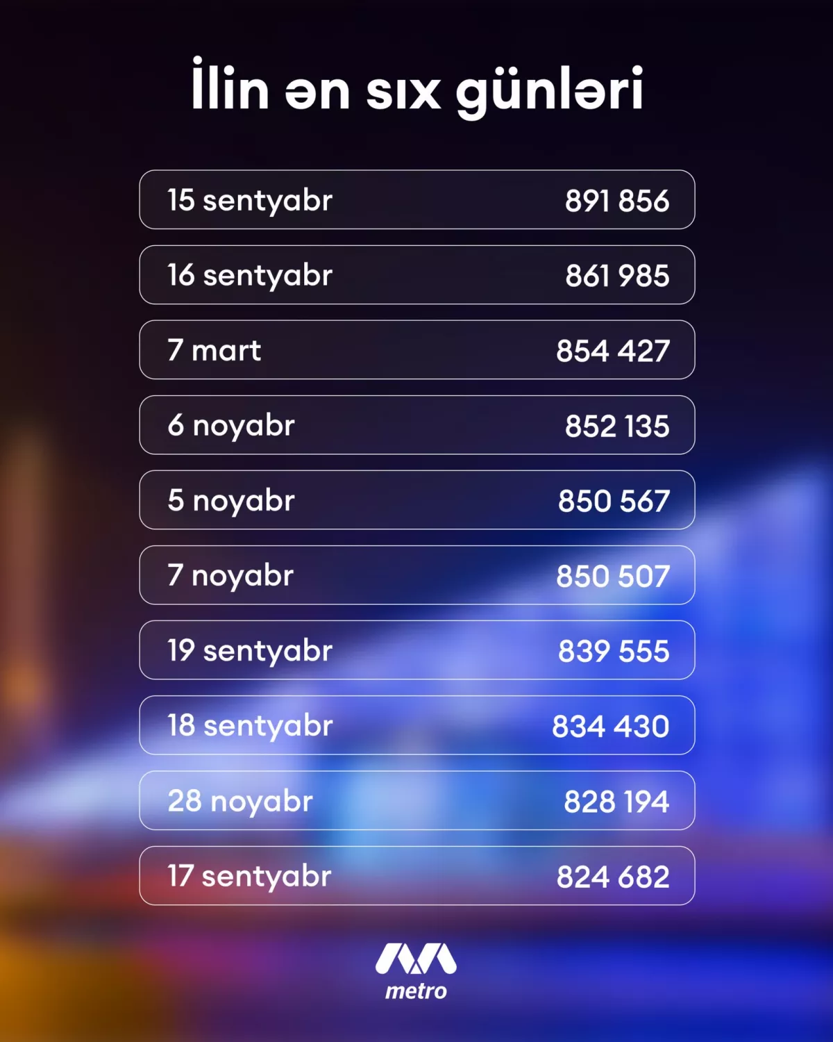 5 станций являются самыми загруженными в Бакметрополитене. На первом месте по загруженности - станция метро «Кёроглу». На втором месте – станция «28 Мая», завершает тройку лидеров станция «20 Января». На четвёртом месте – станция «Гянджлик», на пятом – «Нариман Нариманов».
