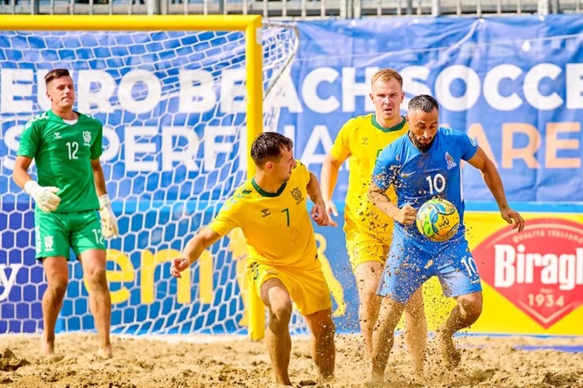 Сегодня сборная Азербайджанау по пляжному футболу провела второй матч группы А промоушн-финала Евролиги в Виареджо (Италия).