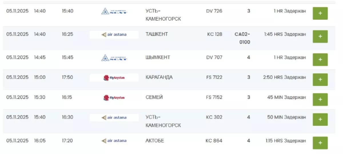 По информации с онлайн-табло, задерживаются прилёты из Шымкента, Усть-Каменогорска, Караганды, Актобе, Семея. Среди международных направлений — рейсы из Шарм-Эль-Шейха, Ташкента, Дели. Время задержки — от 20 минут до более двух часов.