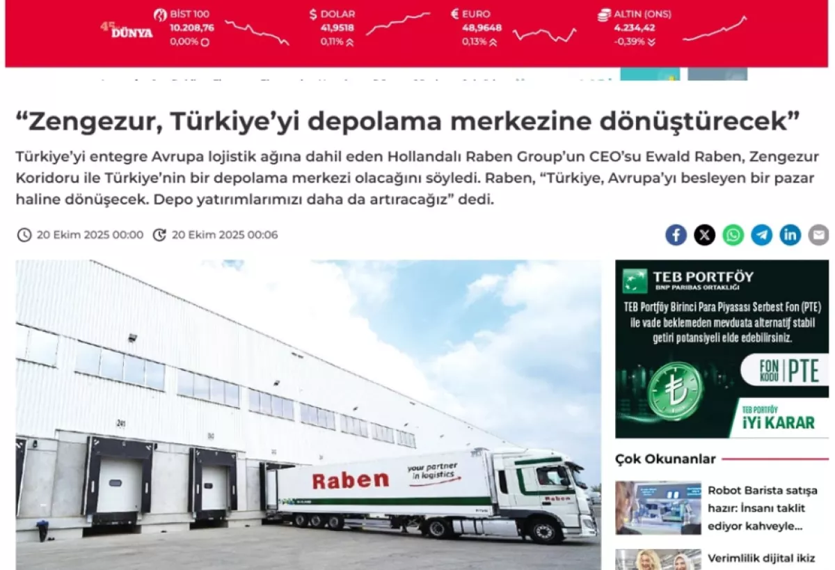Dünya: Зангезурский коридор превратит Турцию в «центр складирования», снабжающий всю Европу