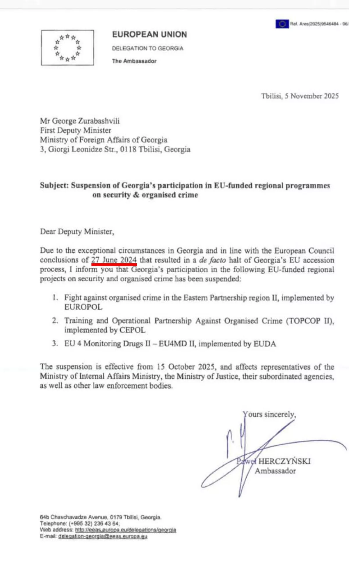 «Принимая во внимание особые обстоятельства в Грузии и в соответствии с выводами Евросовета от 27 июня 2024 года, которые привели к фактической приостановке процесса вступления Грузии в Евросоюз, сообщаем вам, что участие Грузии в следующих финансируемых Европейским союзом региональных проектах в области безопасности и организованной преступности приостановлено», — следует из письма Павла Герчинского.