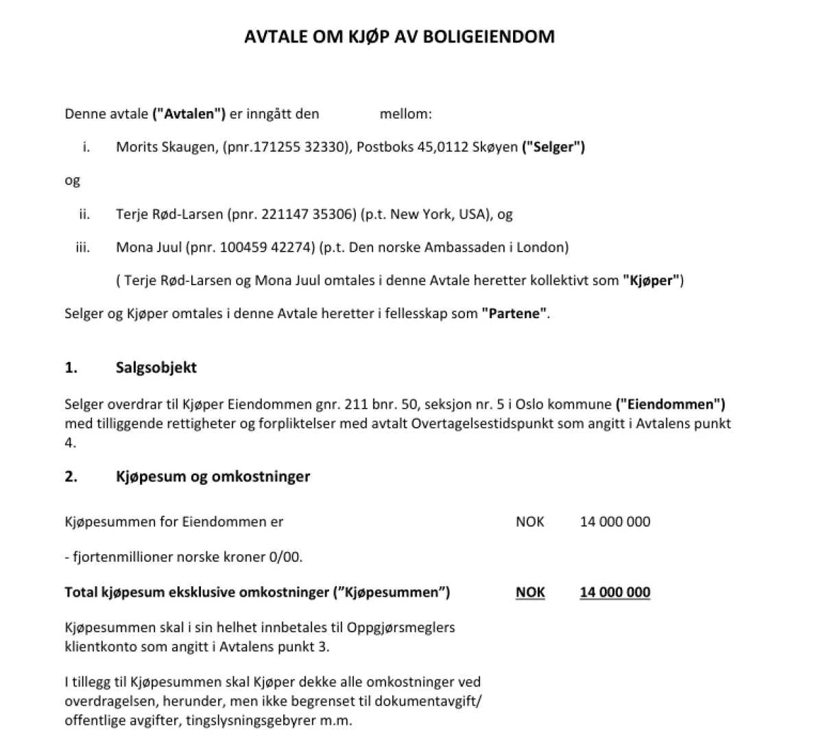 Документы дают основания предполагать, что масштаб этих связей был еще глубже. Среди файлов Эпштейна обнаружен договор купли-продажи жилой недвижимости в Осло на сумму 14 миллионов норвежских крон, где покупателями значатся Терье Рёд-Ларсен и Мона Юль. Почему документы о покупке недвижимости норвежским дипломатом оказались у Эпштейна? Какова была степень его вовлеченности в их финансовые дела?