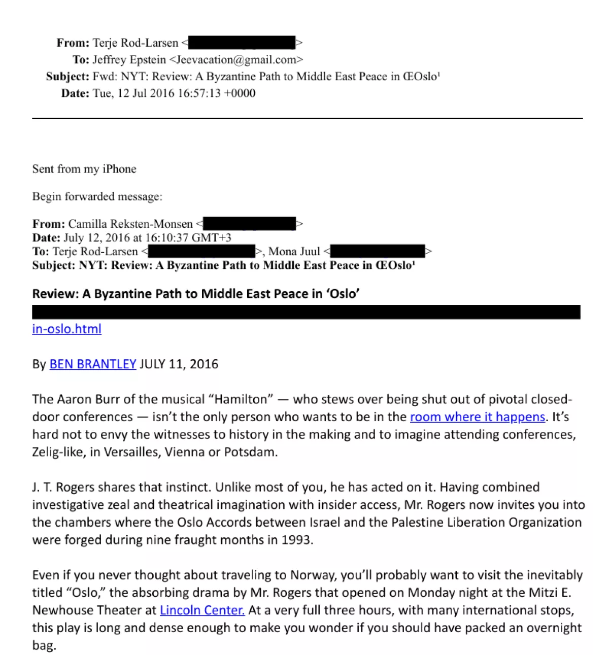 К 2016-2017 годам дружба достигла своего пика. Летом 2016 года муж Моны пересылает Эпштейну рецензию из New York Times на пьесу «Осло», которая повествует об истории норвежского участия в ближневосточном мирном процессе 1990-х годов, и Мона Юль была одной из главных героинь. В рецензии упоминалось: «В центре сюжета — норвежская пара... Мона Юль (в исполнении Дженнифер Эль) и её муж Терье Рёд-Ларсен». Пьеса имела успех, шла на Бродвее, формируя дипломату имидж миротворца. Новостями о своих триумфах семья делилась с Эпштейном.