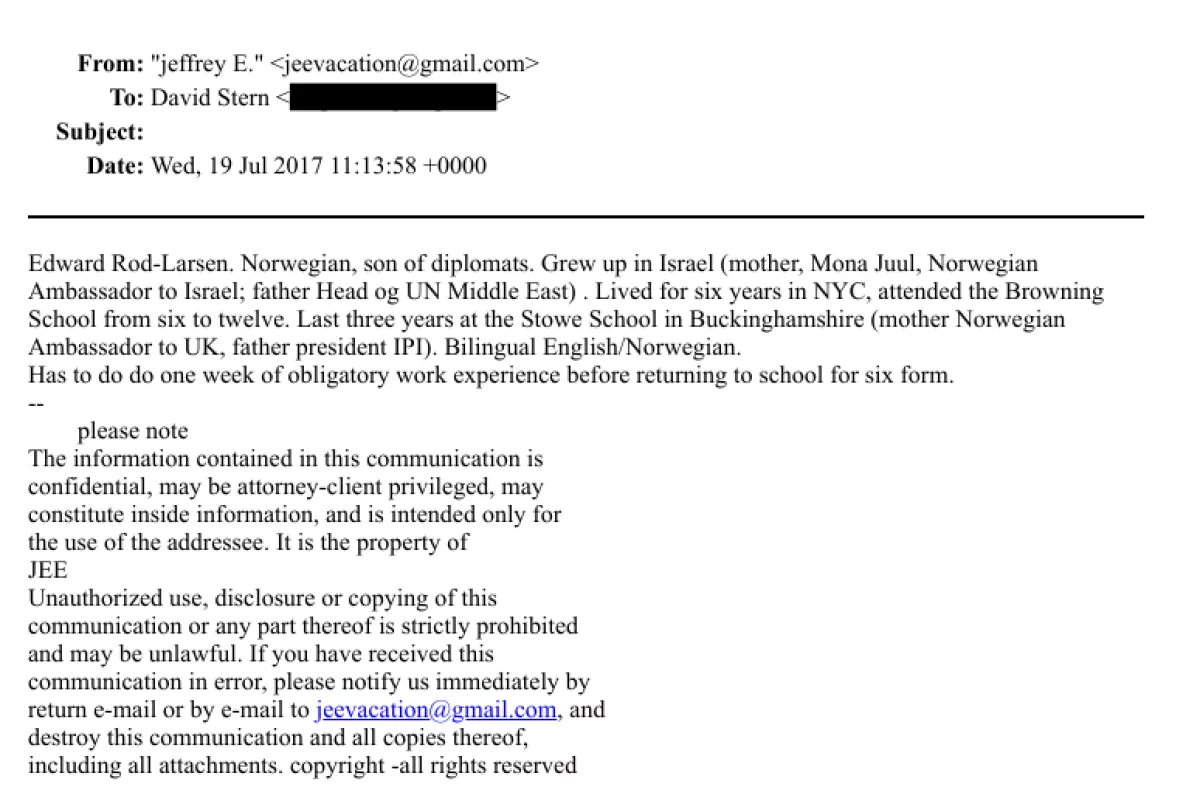 Более того, именно в июле 2017 года, буквально через месяц после Аскота, происходит событие, которое выходит за рамки просто дружеских отношений. 19 июля Эпштейн пишет письмо Дэвиду Стерну, своему контакту в банковской сфере. В письме он пересылает резюме: «Эдвард Рёд-Ларсен. Норвежец, сын дипломатов. Вырос в Израиле (мать, Мона Юль, посол Норвегии в Израиле; отец, глава ближневосточного отдела ООН)... Нужно пройти одну неделю обязательной рабочей практики». То есть, Эпштейн лично занимается трудоустройством их сына.