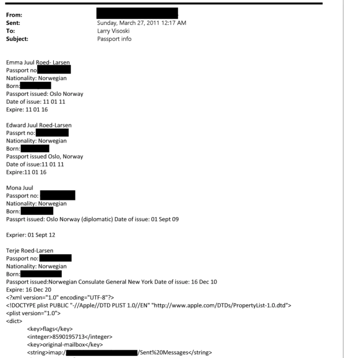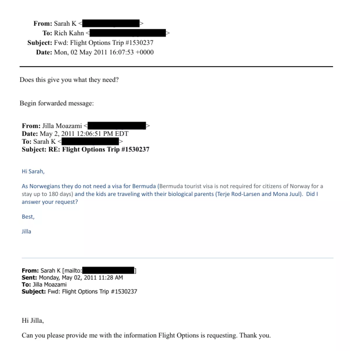 Помощница Джилла Моазами пишет в офис Эпштейна: «Поскольку они норвежцы, им не нужна виза на Бермуды... дети путешествуют со своими биологическими родителями — Терье Рёд-Ларсеном и Моной Юль». Это письмо было переслано Ричу Кану, менеджеру Эпштейна, что прямо указывает на вовлеченность структур Эпштейна в организацию и, вероятно, оплату этого рейса. За месяц до вылета пилоту Эпштейна Ларри Висоски были отправлены сканы паспортов всей семьи. Напротив имени Моны Юль стоит «Passport issued: Oslo, Norway (diplomatic)» — дипломатический паспорт.