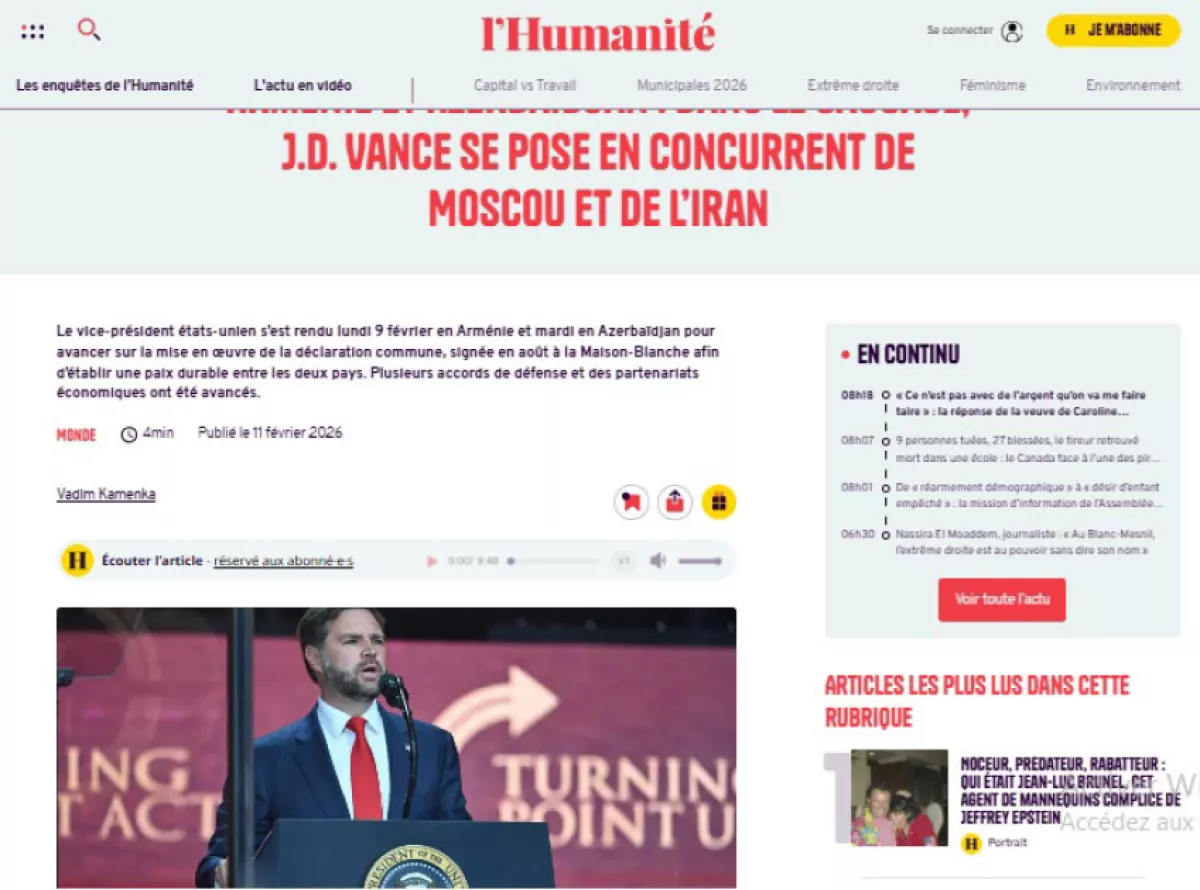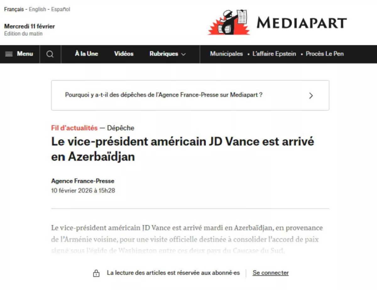 Французские новостные порталы, теле- и радиостанции осветили визит вице-президента США Джей Ди Вэнса в Баку и его встречу с Президентом Ильхамом Алиевым.