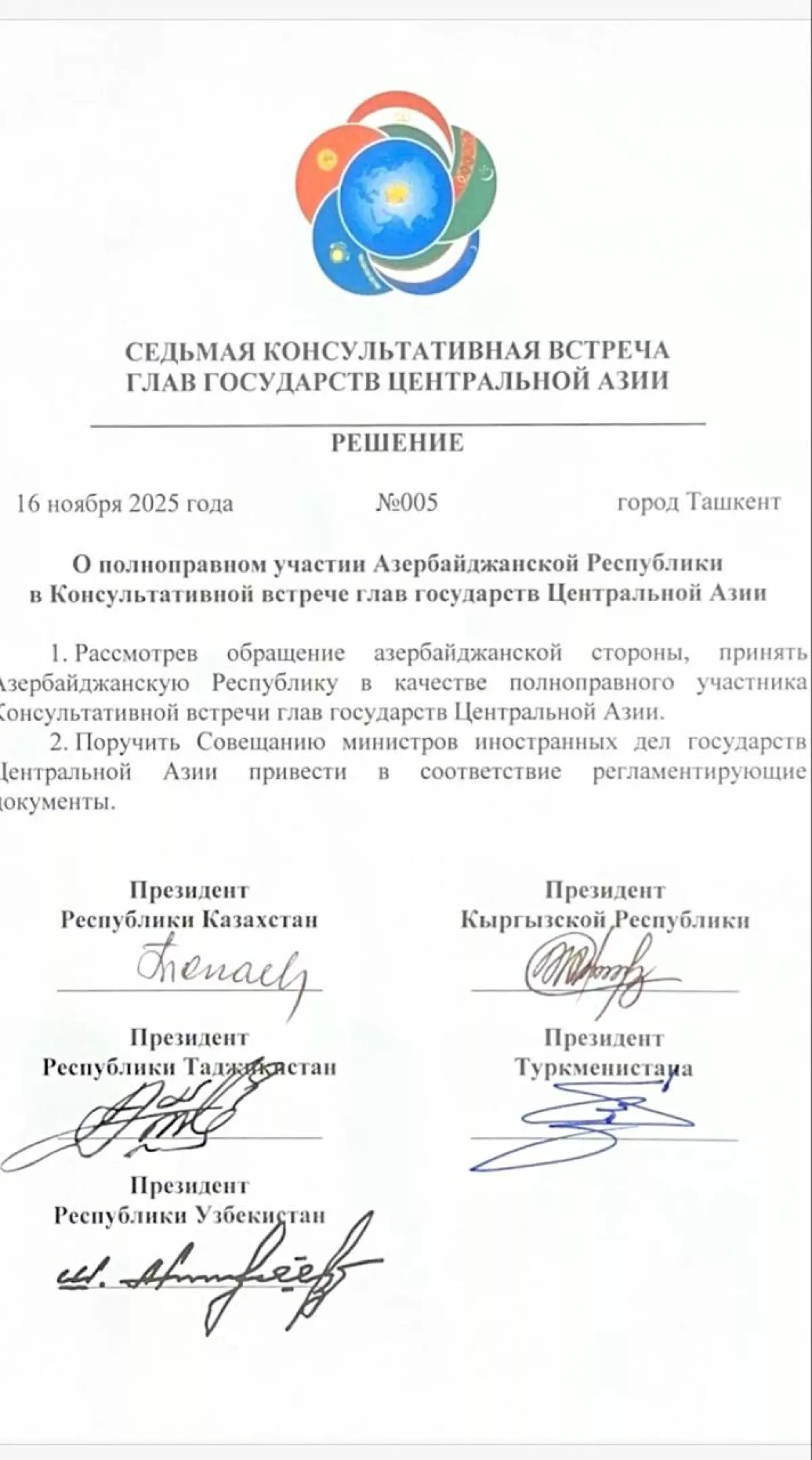 Кроме того, как сообщает Caliber.Az, в соцсети X Гаджиев поделился документом о принятии Азербайджана в качестве полноправного участника Консультативной встречи глав государств Центральной Азии.