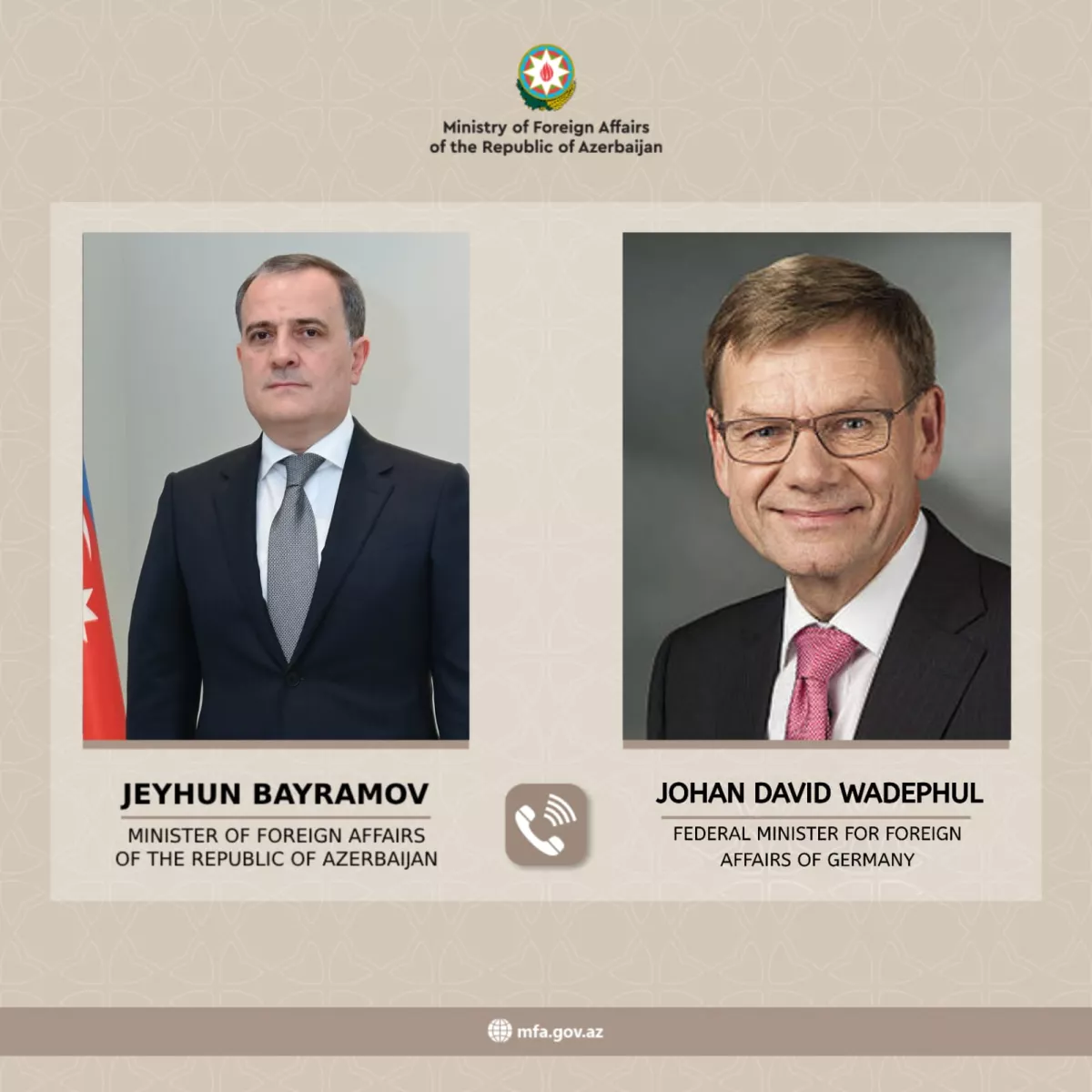 Министр иностранных дел Германии Йоханн Давид Вадефуль сегодня позвонил министру иностранных дел Азербайджана Джейхуну Байрамову.