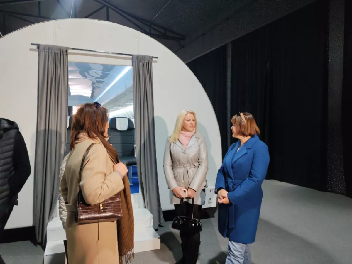 Участники осмотрели установленные в павильоне декорации: самолет, вертолет, тюрьму, научную лабораторию и трехсторонние конструкции на зеленом экране.