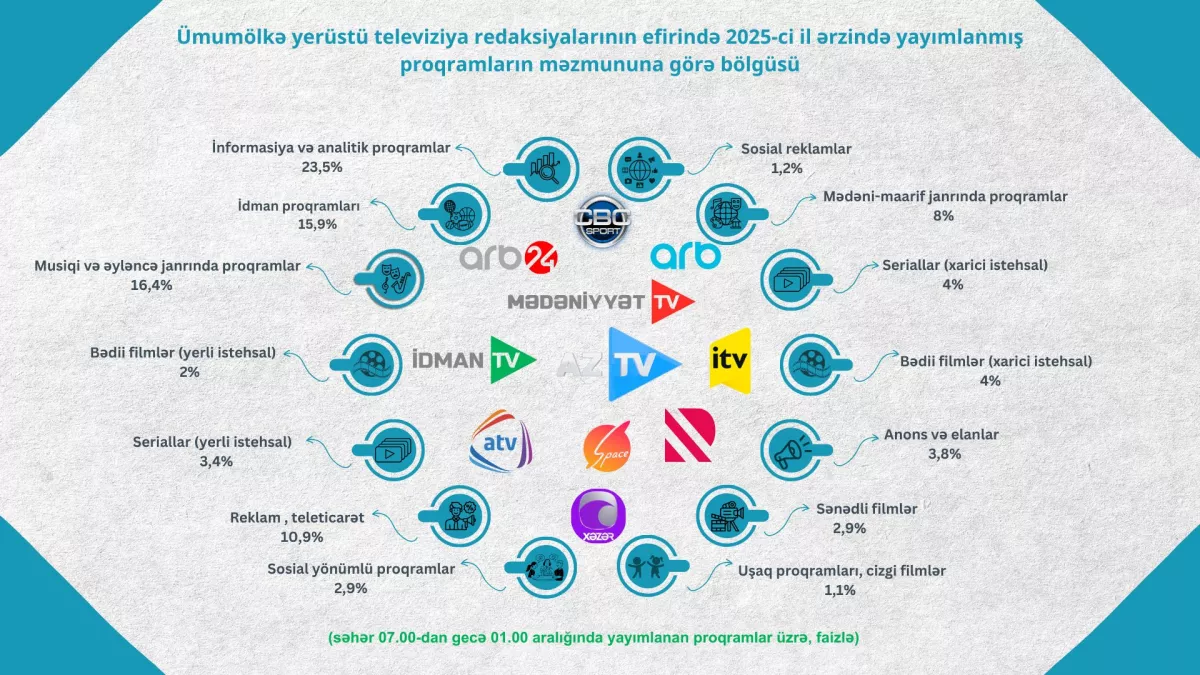 Аудиовизуальный совет Азербайджана подготовил статистику содержательно-жанрового распределения программ, транслировавшихся на общереспубликанских телеканалах в 2025 году.