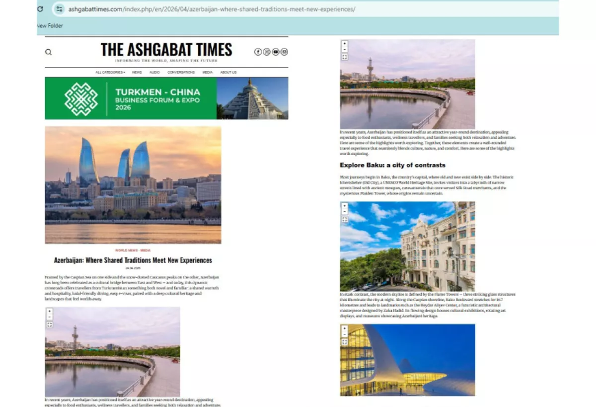 Как передает AЗEРTAДЖ, материал, опубликованный на туркменском, английском и русском языках на авторитетном портале ashgabattimes.com, предоставляет информацию о туристических возможностях Азербайджана, ключевых маршрутах, историческом и культурном наследии страны, а также современной туристической инфраструктуре. Особое внимание уделяется Баку - городу, в котором гармонично сочетаются современные и исторические элементы.