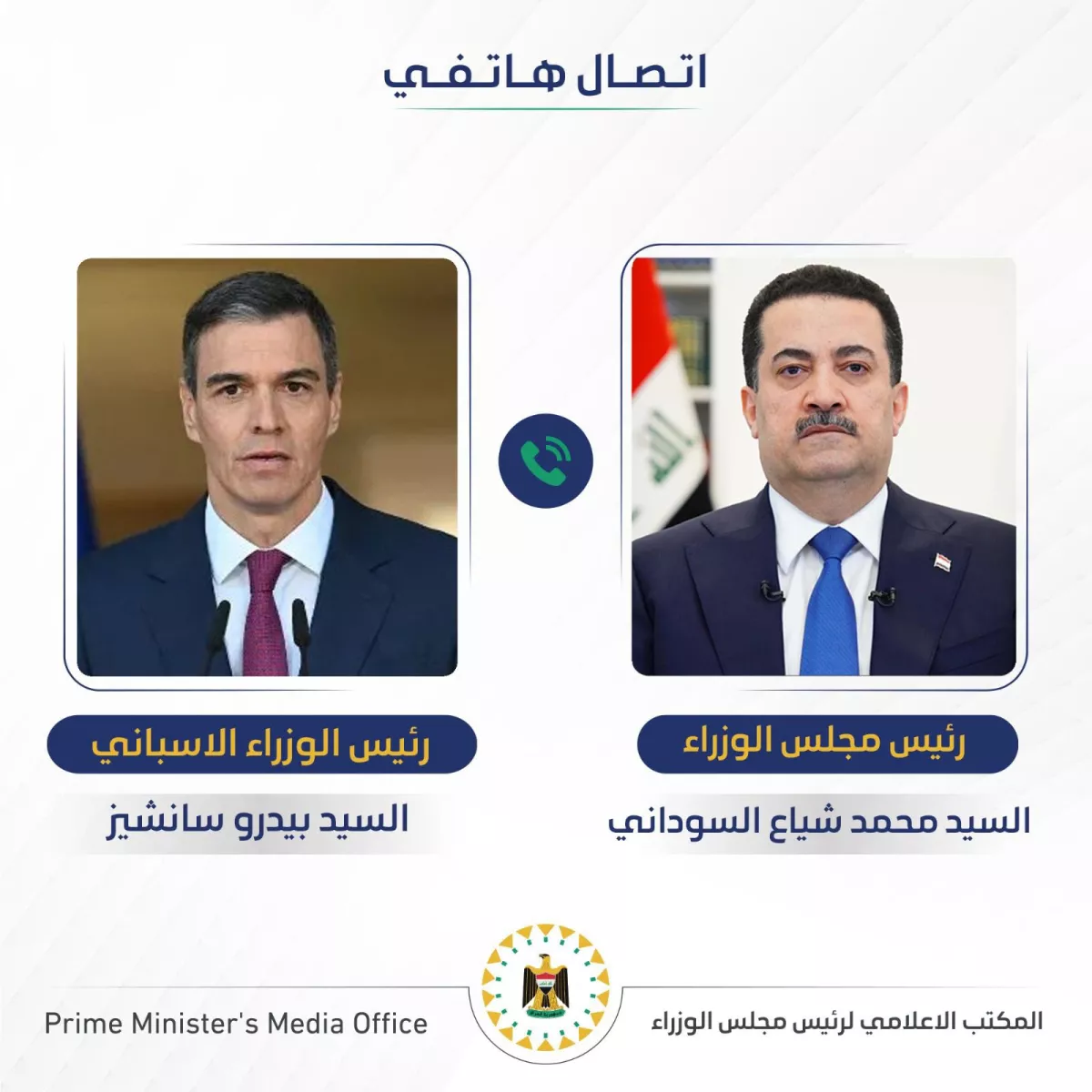رئيس مجلس الوزراء السيد محمد شياع السوداني يجري مباحثات هاتفية مع رئيس الوزراء الاسباني السيد بيدرو سانشيز، تناولت تطورات الأوضاع الأمنية في المنطقة وتداعيات العمليات العسكرية على الأمن الإقليمي والدولي، وكذلك تأثيرها على سلاسل الإمدادات العالمية.