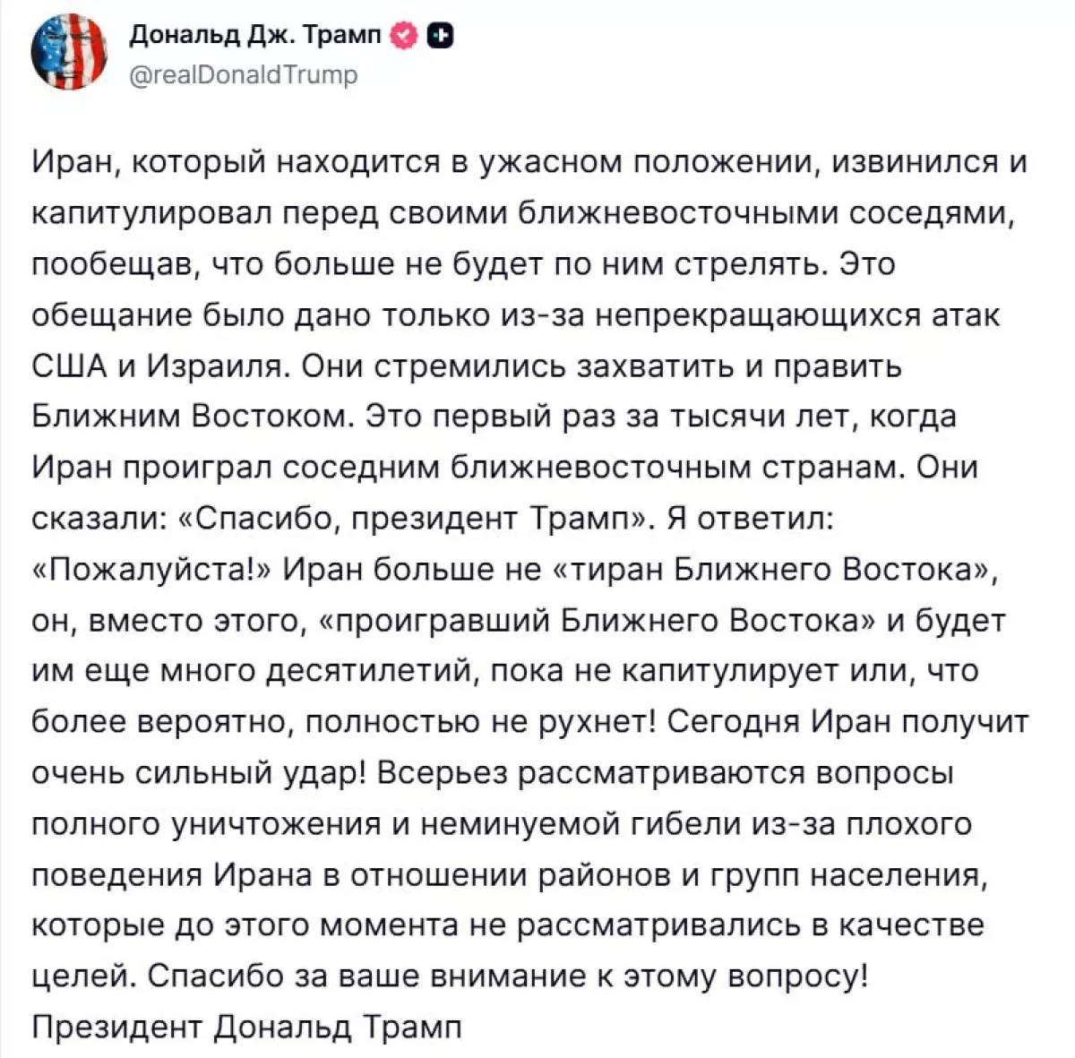 Пезешкиан также добавил, что иранский ответ на агрессию продолжается, но не имеет отношения к соседним странам и их народам.