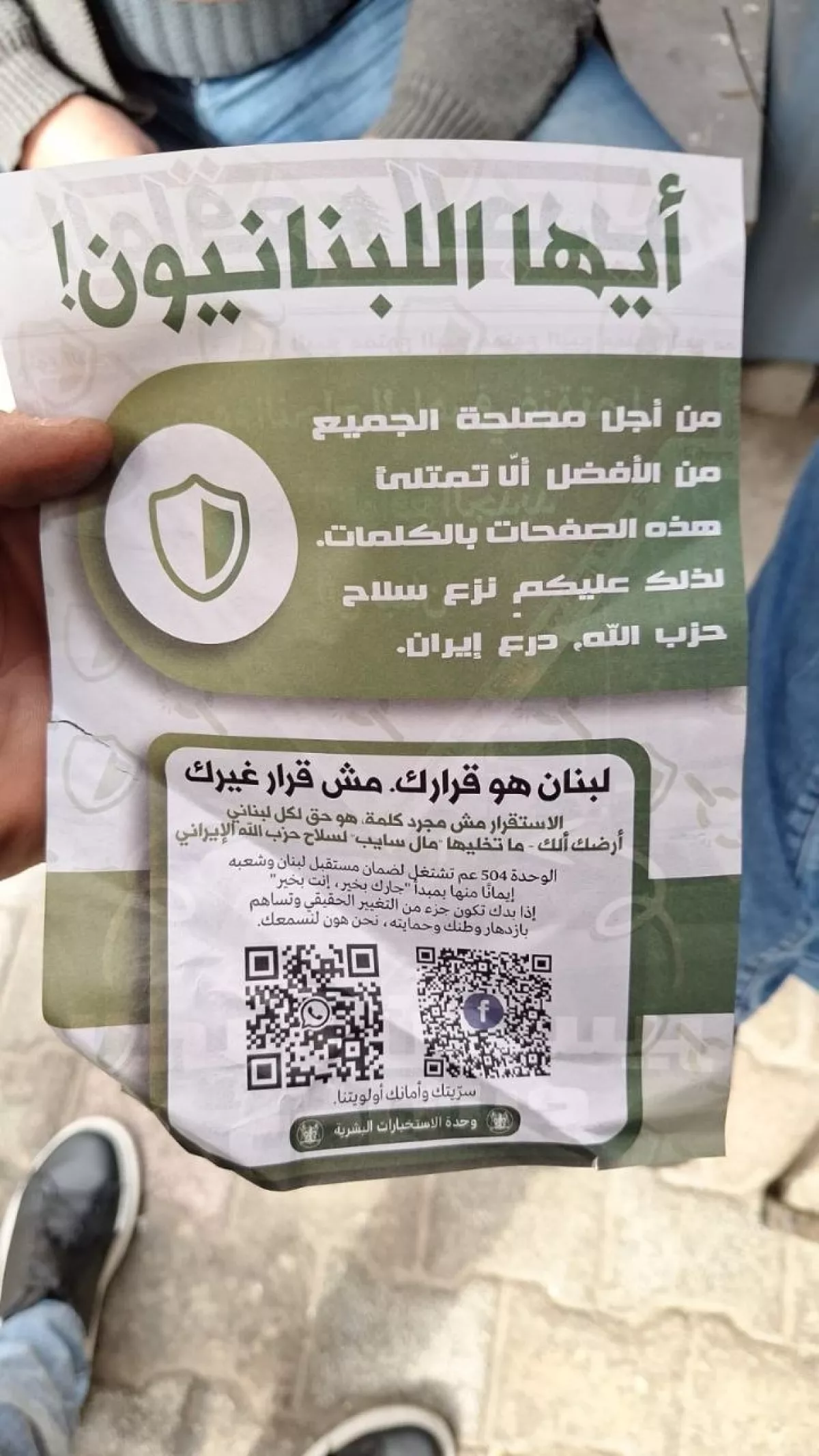 По данным источников, листовки содержали призыв к гражданам Ливана связаться с израильским разведывательным подразделением «Отдел 504», специализирующимся на вербовке агентов и сборе информации.