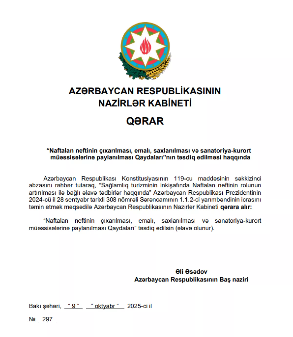 Кабинет министров Азербайджана утвердил «Правила добычи, переработки, хранения нафталанской нефти, распределения ее по санаторно-курортным учреждениям».