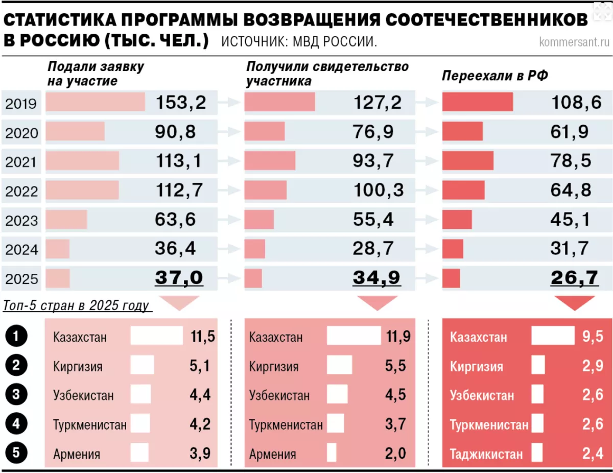 Однако казахстанцы больше остальных подали заявок на переселение в Россию. Представители РК составили 35,5 % от всех переехавших. Это, прежде всего, связано с тем, что в Казахстане больше этнических русских.