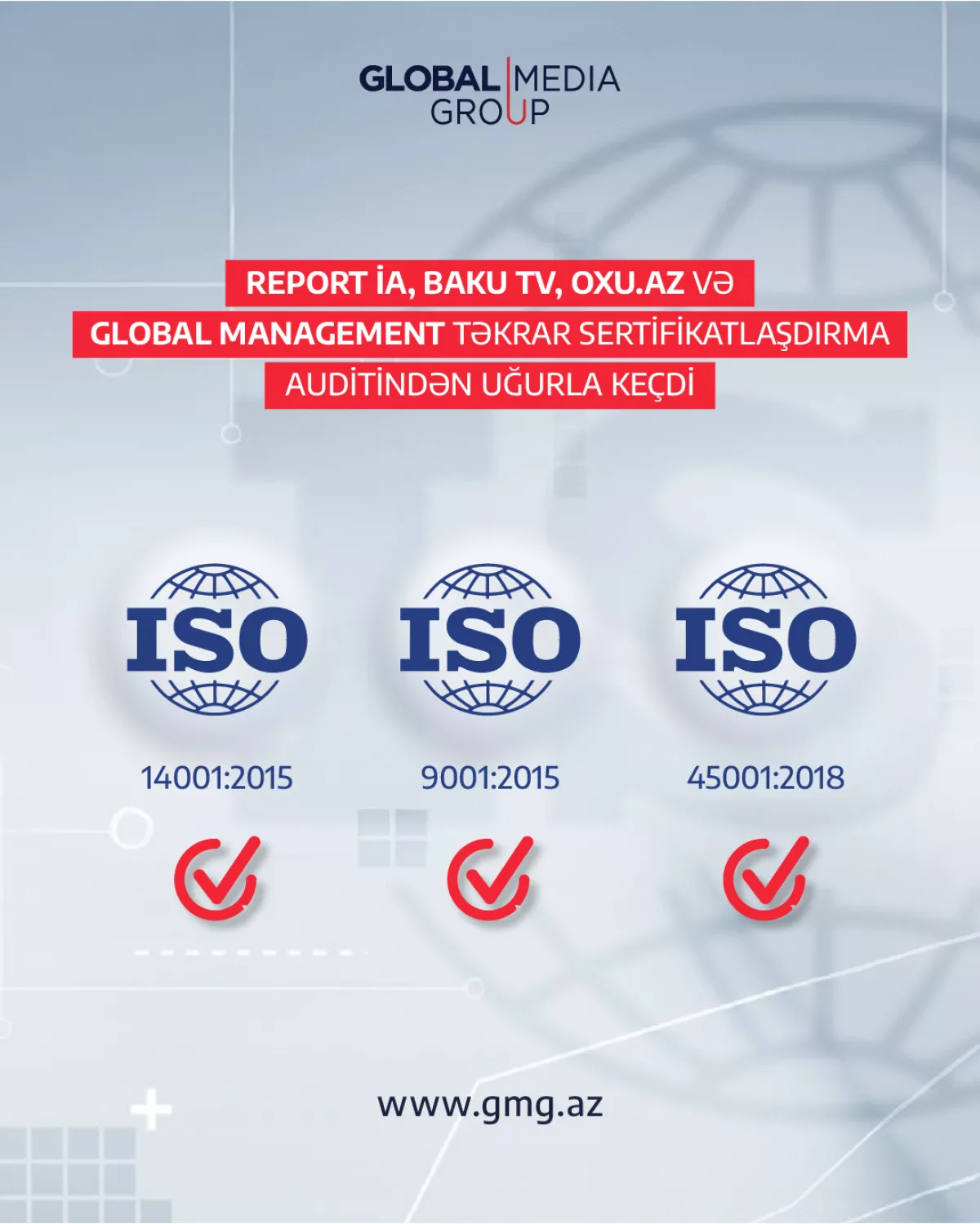 Входящие в Global Media Group новостной телеканал Baku TV, новостной сайт Oxu.az, информационное агентство Report и аутсорсинговая компания Global Management успешно прошли повторный аудит по международным стандартам управления.