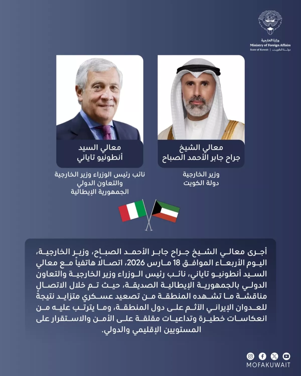 أجرى معالي الشيخ جراح جابر الأحمد الصباح، وزير الخارجية، اليوم الأربعاء الموافق 18 مارس 2026، اتصالاً هاتفياً مع معالي السيد أنطونيو تاياني، نائب رئيس الوزراء وزير الخارجية والتعاون الدولي بالجمهورية الإيطالية الصديقة، حيث تم خلال الاتصال مناقشة ما تشهده المنطقة من تصعيد عسكري… pic.twitter.com/Zf7M9v5LH2