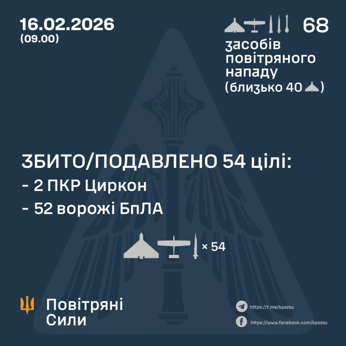 В ночь на 16 февраля,силы РФ совершили масштабную атаку на территорию Украины. Противник применил четыре противокорабельные ракеты «Циркон», баллистическую ракету «Искандер-М», управляемую авиационную ракету Х-31П, а также 62 ударных беспилотника типов «Шахед», «Гербера», «Италмас» и других. Около 40 из применённых БПЛА были «Шахедами».