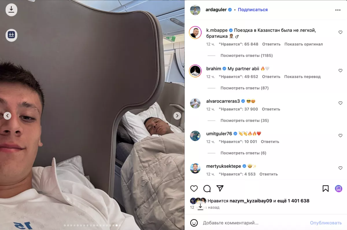 Как передаёт Tengri Sport, партнёр Мбаппе по «Реалу», турецкий полузащитник Арда Гюлер, опубликовал несколько фотографий с деталями полёта мадридцев в Алматы.