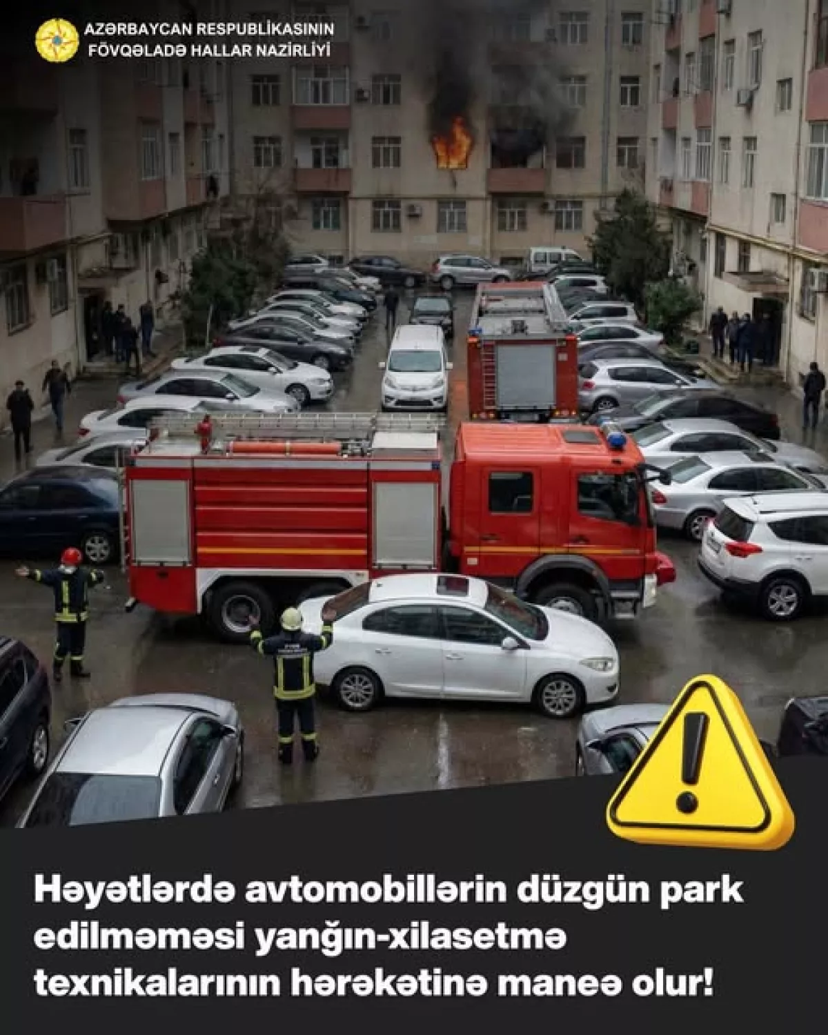 Министерство по чрезвычайным ситуациям Азербайджана поделилось публикацией об опасности тесной заставки бакинских дворов припаркованными автомобилями.