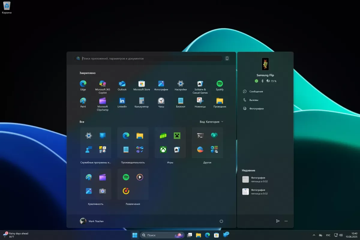 Кроме того, приложения из раздела «Все» перенесены на главный экран меню, появилась возможность группировать программы по категориям — функция уже вызвала неоднозначные отзывы. Панель Phone Link стала необязательной и отображается сбоку только при необходимости.