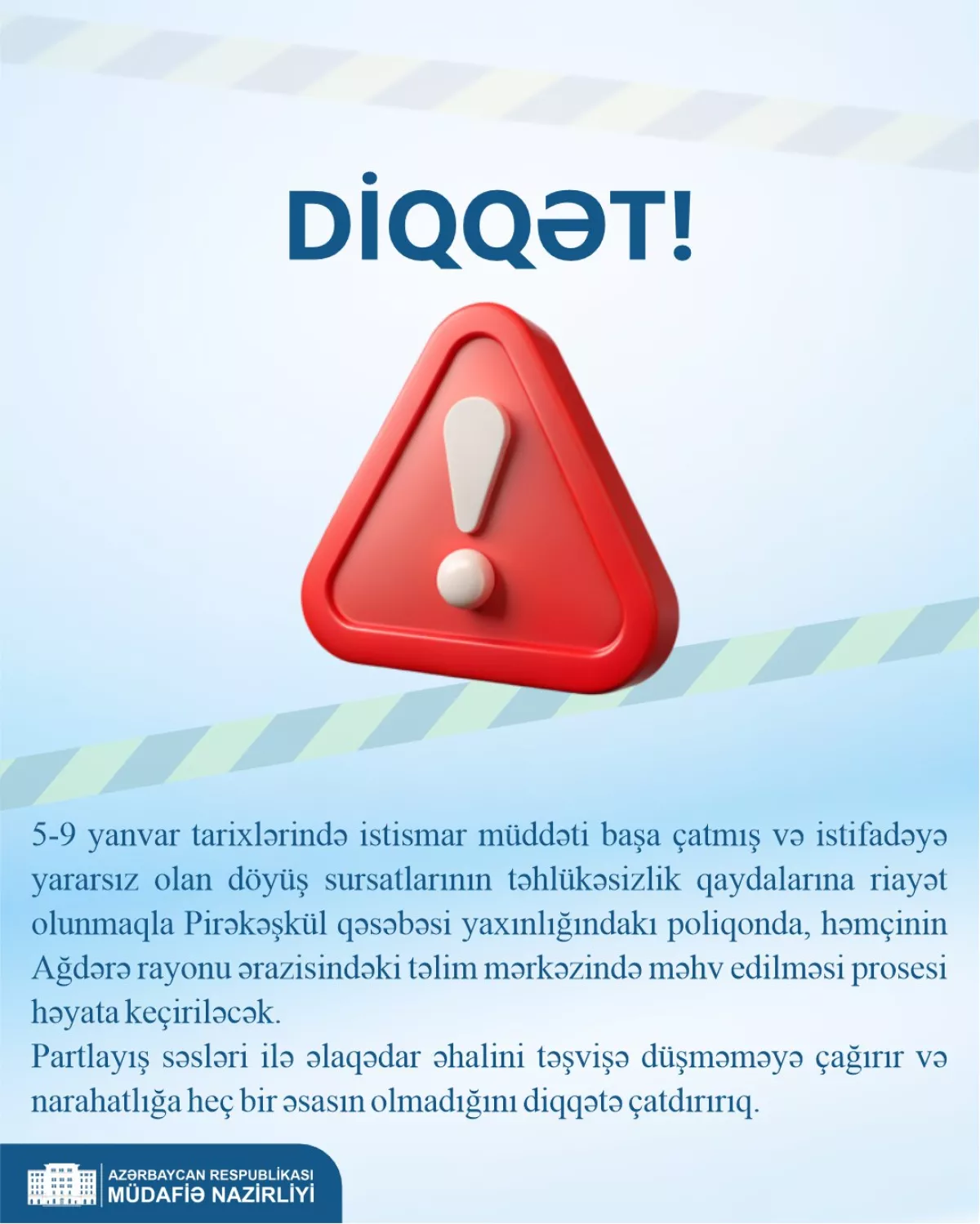 С 5 по 9 января на полигонах вблизи поселка Пирекешкюль и на территории Агдеринского района с соблюдением техники безопасности будет выполняться утилизация непригодных к использованию боеприпасов.
