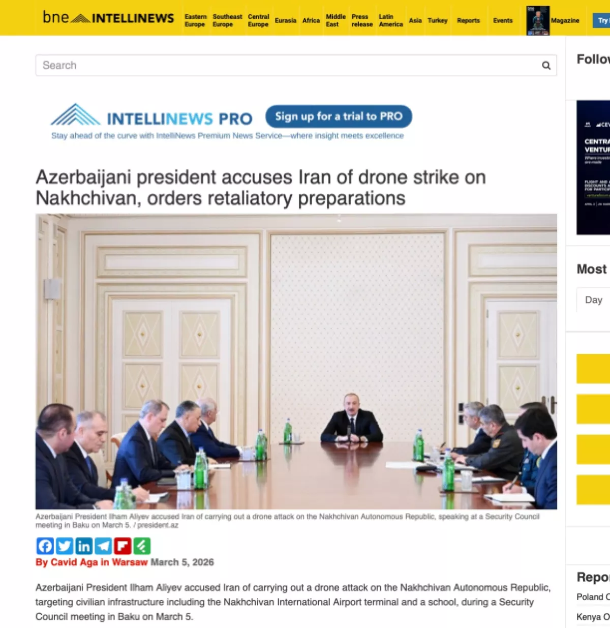 Intellinews, OC Media, Times of Israel, Middle East Eye, News24, Daily Mail, The New Region и другие медиаплатформы, ссылаясь на выступление Президента Ильхама Алиева, также написали, что силы безопасности Азербайджана приведены в состояние мобилизации номер один.