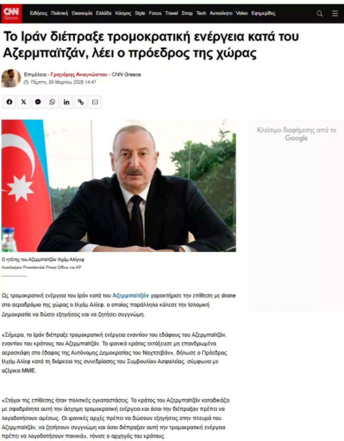 CNN Greece отмечает, что Президент Ильхам Алиев заявил о возможных серьезных последствиях этого террористического акта со стороны Ирана. Официальный Баку поднял вопрос ответственности иранской стороны за произошедшее и потребовал от Тегерана официальных разъяснений.