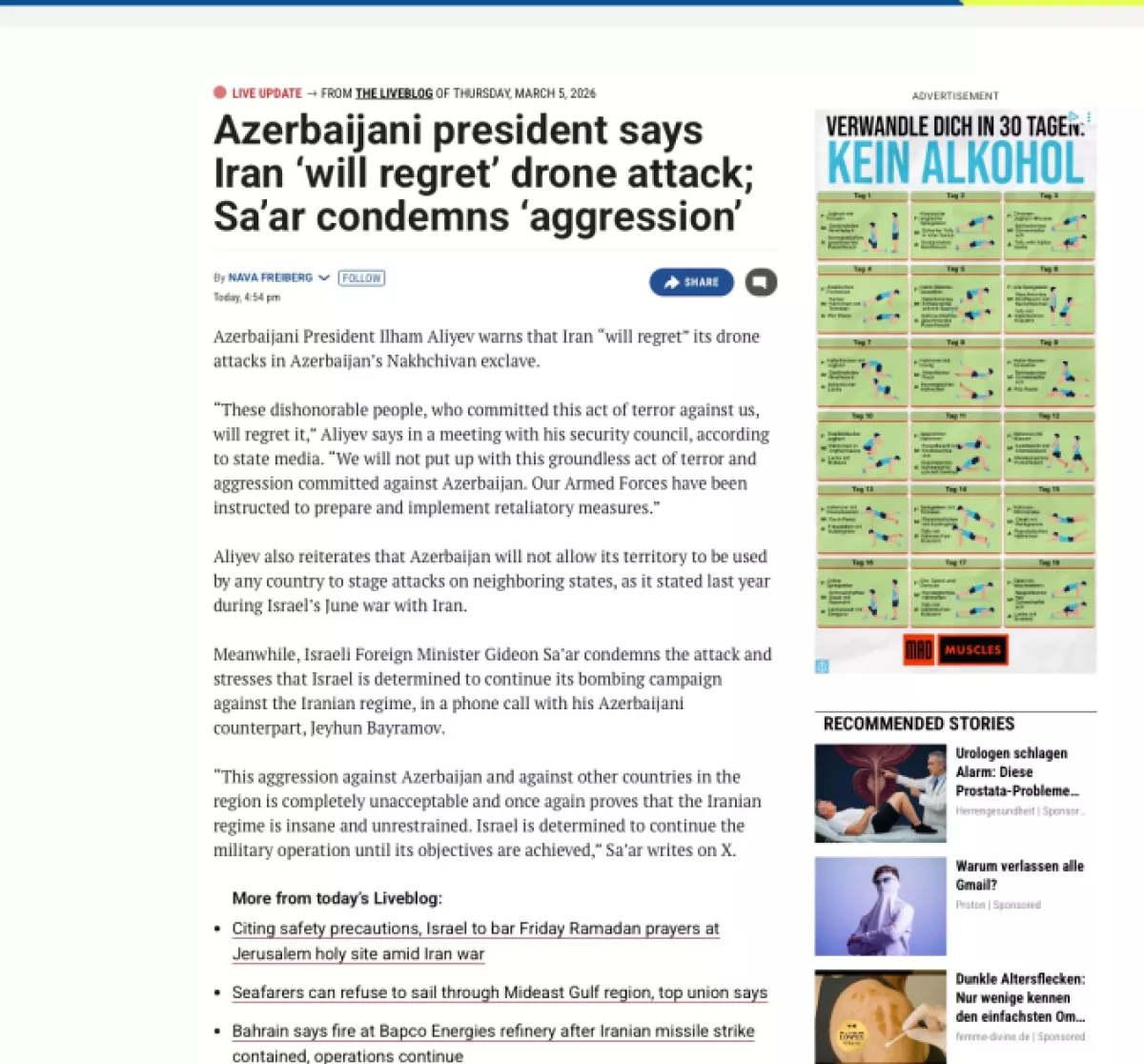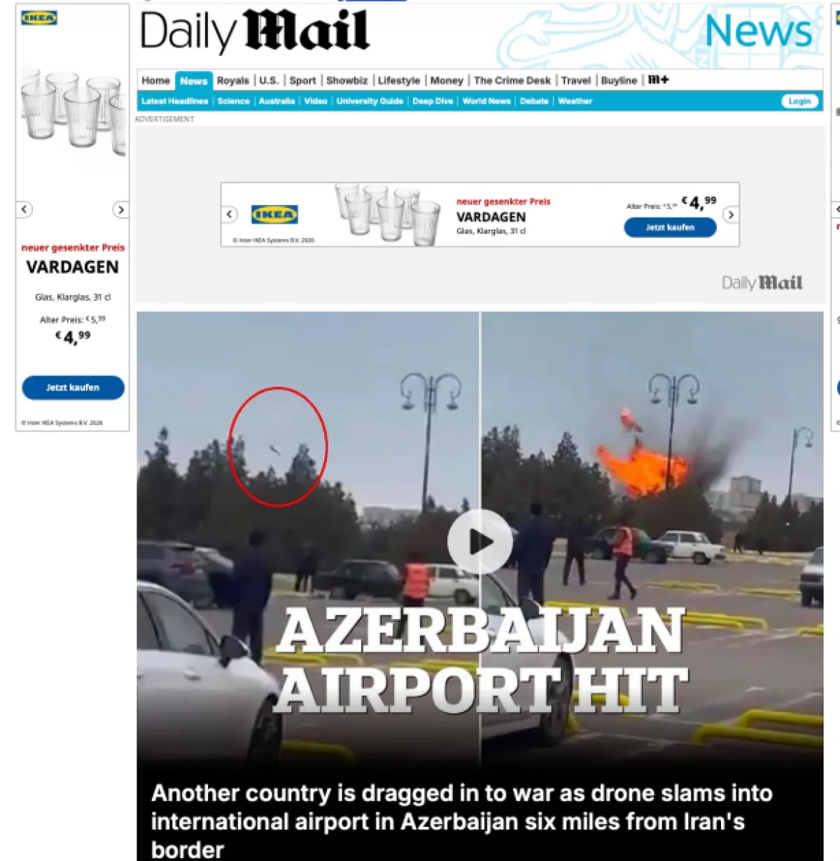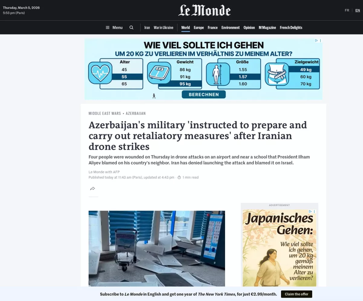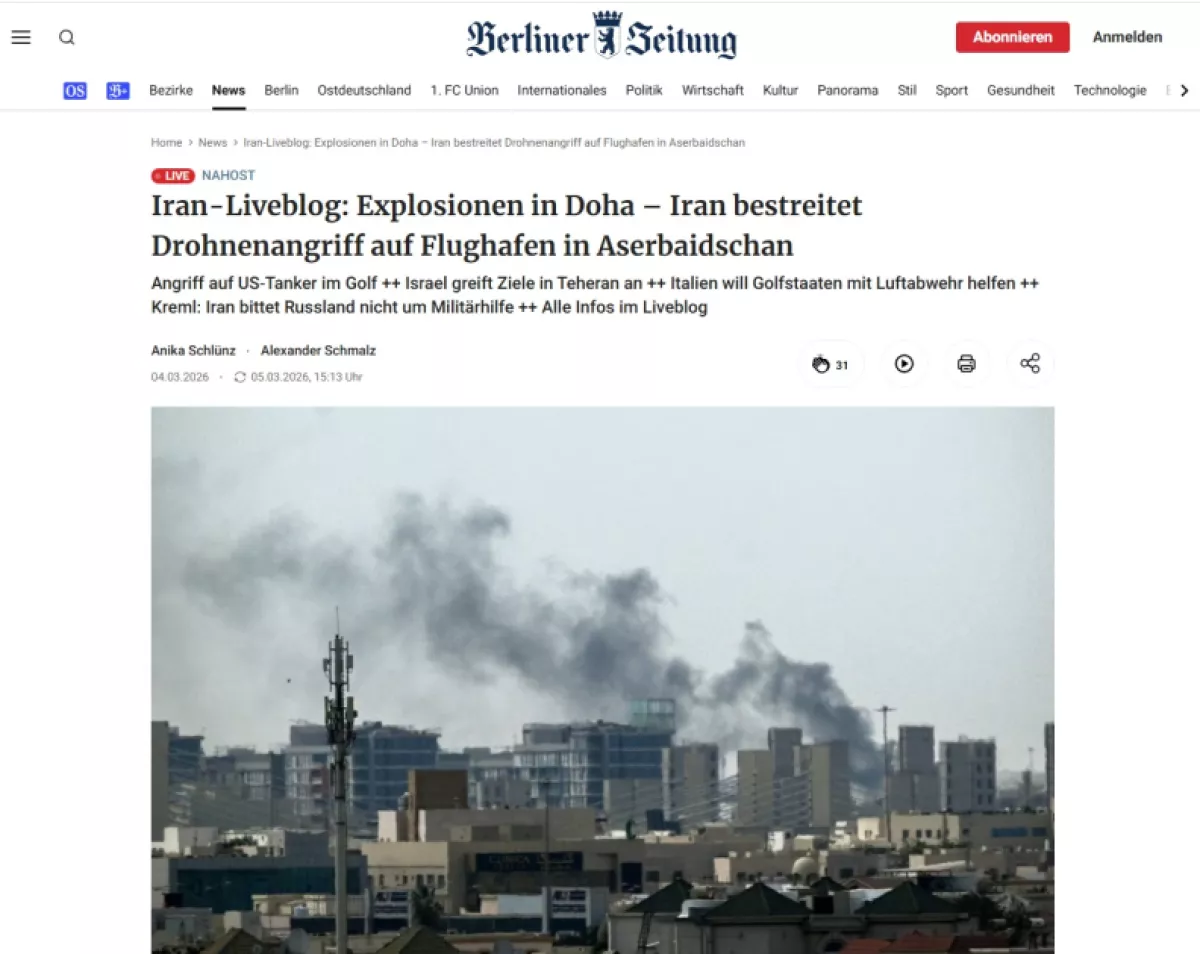 Газета Tagesspiegel отметила, что война с Ираном распространяется на все большее число стран, и написала, что беспилотники упали вблизи аэропорта и школы в Нахчыванской Автономной Республике Азербайджана. Отмечалось, что Азербайджан заявил о намерении принять ответные меры за этот отвратительный террористический акт, а также о том, что по указанию Президента Ильхама Алиева Вооруженные силы были приведены в боевую готовность.
