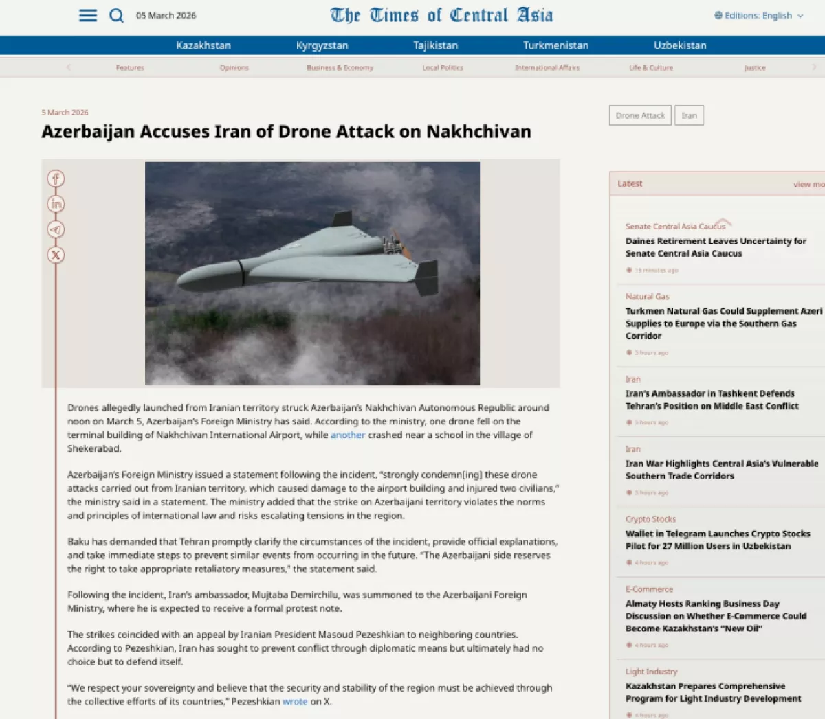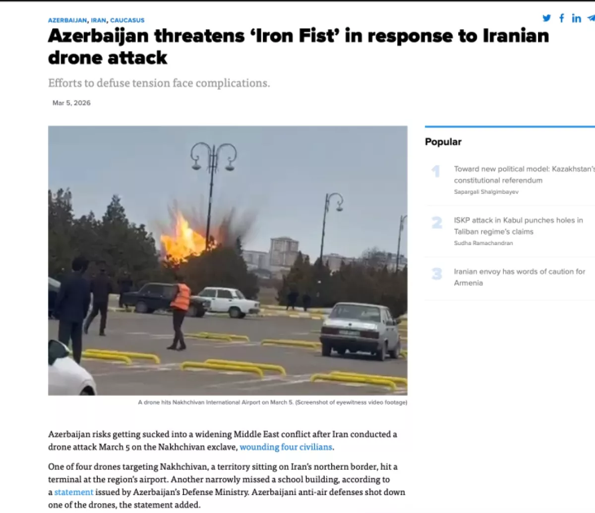 Издание отмечает, что один из беспилотных летательных аппаратов упал на один из объектов, расположенных на территории Азербайджана, и в результате инцидента несколько человек получили ранения. В статье говорится, что Президент Ильхам Алиев назвал этот инцидент серьезным происшествием в сфере безопасности и подчеркнул, что Иран должен нести ответственность.