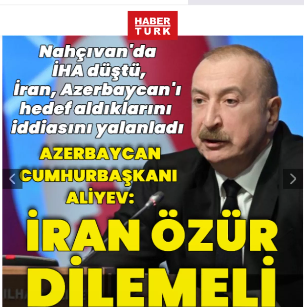 В приведенной цитате из выступления Президента Азербайджана говорится: «Сегодня со стороны Ирана был совершен террористический акт против азербайджанской территории, против Азербайджанского государства. Иранское государство подвергло территорию Нахчыванской Автономной Республики обстрелу с использованием беспилотных летательных аппаратов. Целями обстрела стали гражданские объекты. Иран подло обстрелял Нахчыванский международный аэропорт, здание терминала, школу и другие направления. Азербайджанское государство решительно осуждает этот отвратительный террористический акт, те, кто это совершил, должны быть немедленно привлечены к ответственности».