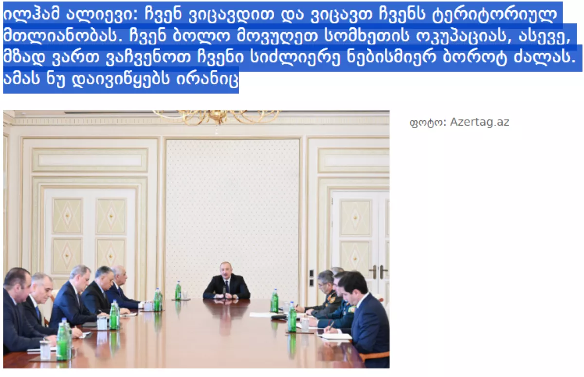 Информационные порталы, радио и телеканалы interpressnews.ge, imedinews.ge, bpn.ge, 1tv.ge, radiotavisupleba.ge, qafqazturk.com, aktual.ge, interpress.ge, 24news.ge, rustavi2.ge, palitranews.ge сообщили, что Президент Ильхам Алиев решительно осудил дроновые атаки со стороны Ирана на территорию Нахчыванской Автономной Республики.