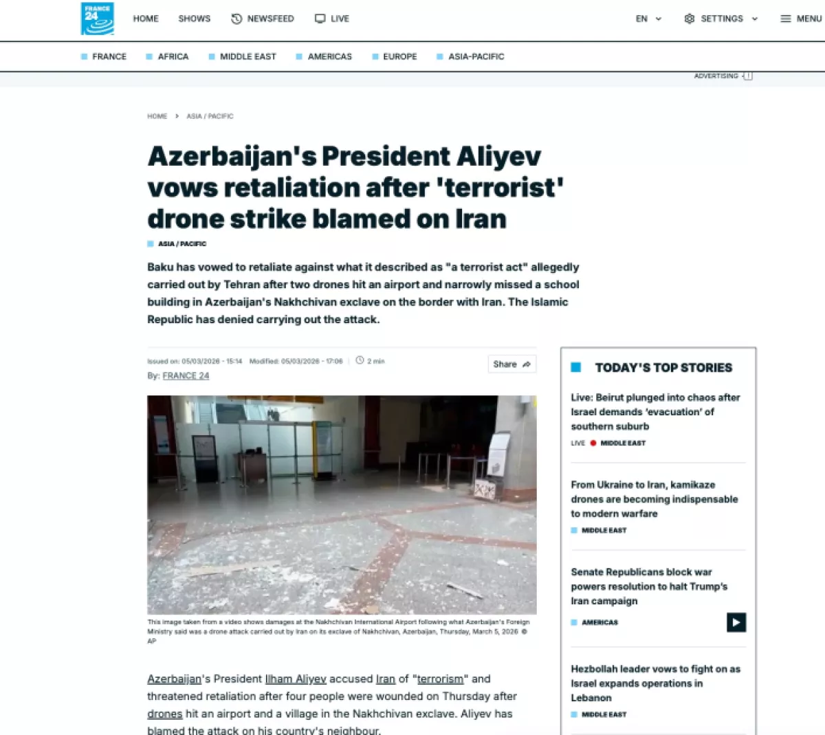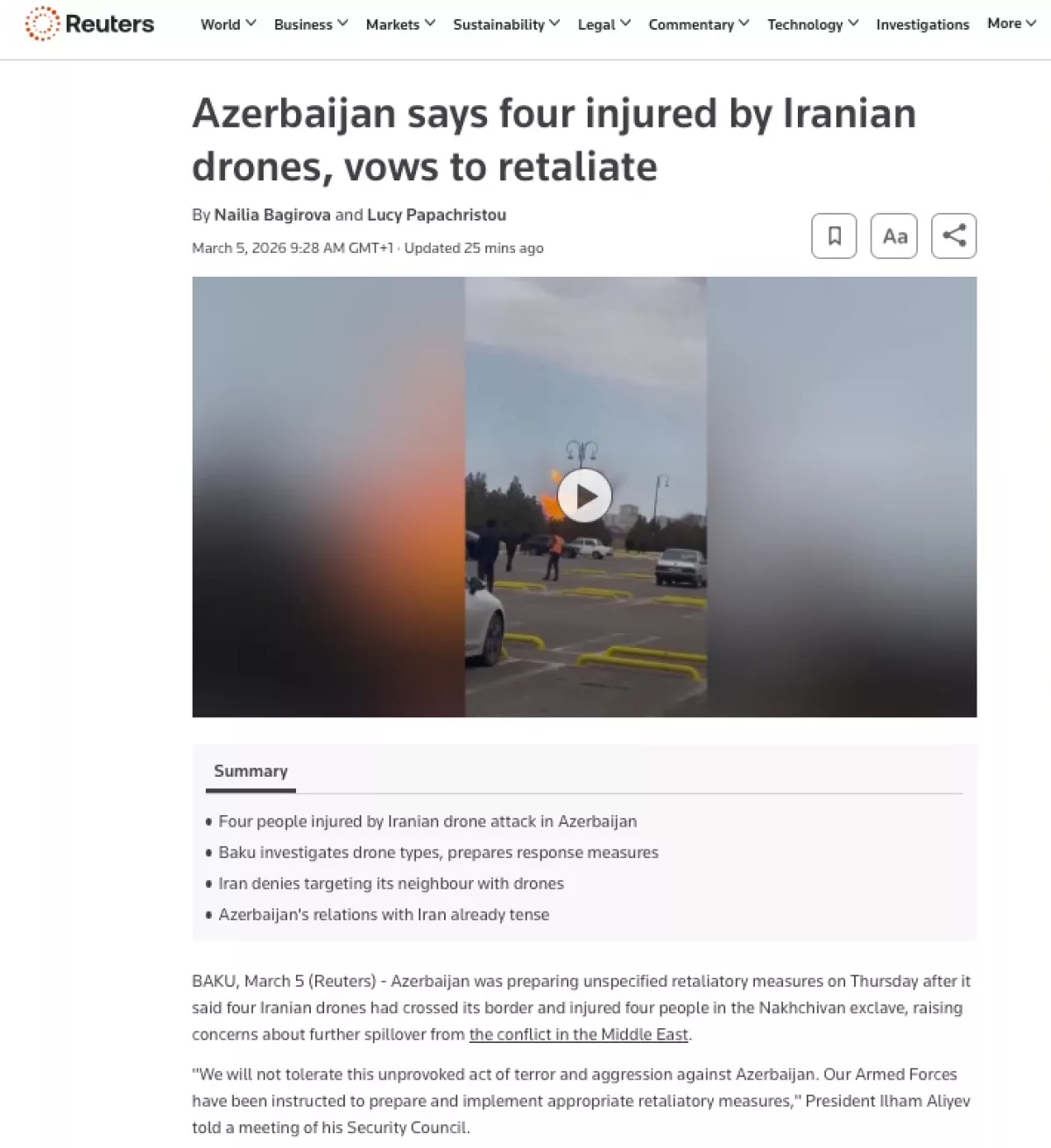 Агентство Reuters пишет, что один из беспилотных летательных аппаратов, запущенный из Ирана, упал возле здания терминала Нахчыванского международного аэропорта, а другой - рядом с сельской школой. Как сообщает агентство, официальные лица Азербайджана расследуют инцидент, усилены меры безопасности. Также отмечается, что в результате атаки нанесен ущерб гражданской инфраструктуре и есть раненые. В статье приводятся цитаты Президента Ильхама Алиева. «Мы не смиримся с этим необоснованным террористическим актом и агрессией против Азербайджана. Нашим Вооруженным силам было поручено подготовить и осуществить ответные меры», - заявил Президент Азербайджана.