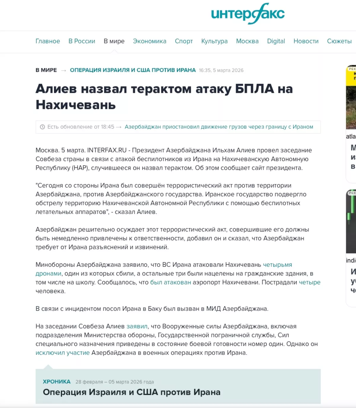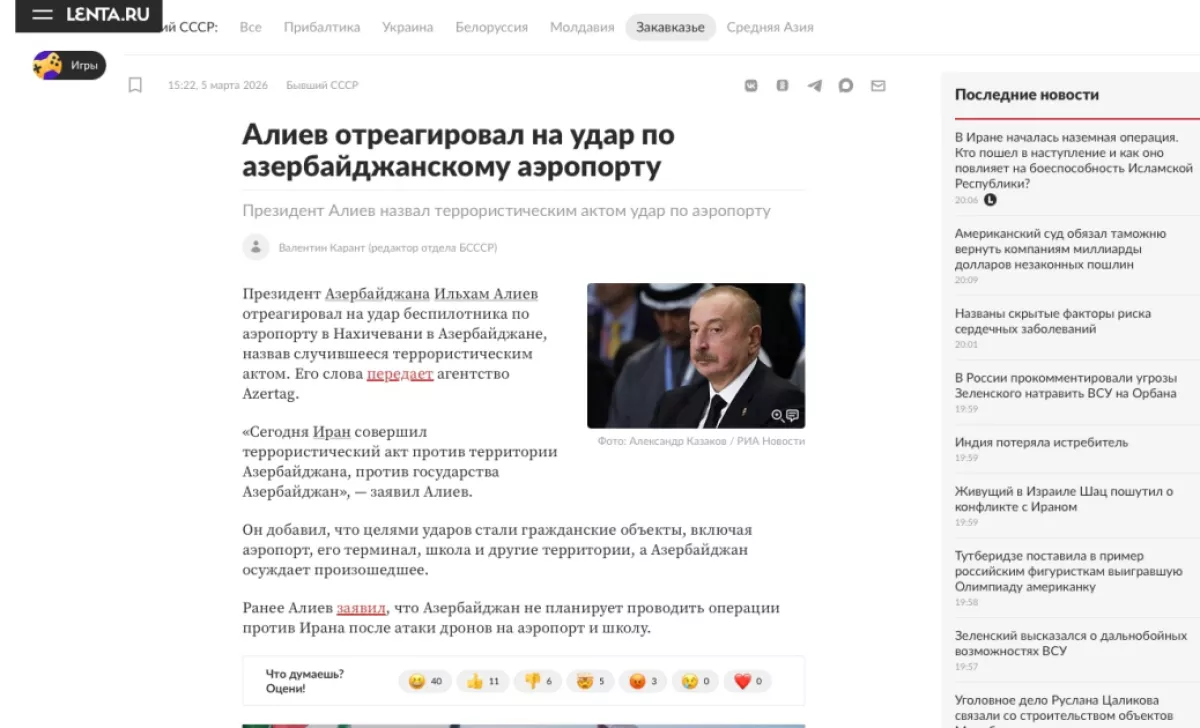 Российские информационные ресурсы РБК, «Ведомости», РИА Новости, Интерфакс, «Комсомольская правда», Lenta.ru, Meduza, «Российская газета» и другие также широко осветили заявление Президента Ильхама Алиева, отметив, что глава государства расценил атаку Ирана как террористический акт, Азербайджанская армия приведена в состояние мобилизации номер один.