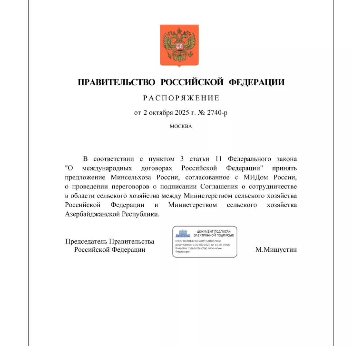Премьер-министр России Михаил Мишустин подписал распоряжение, касающееся переговоров России и Азербайджана в области сельского хозяйства, сообщает Caliber.Az.