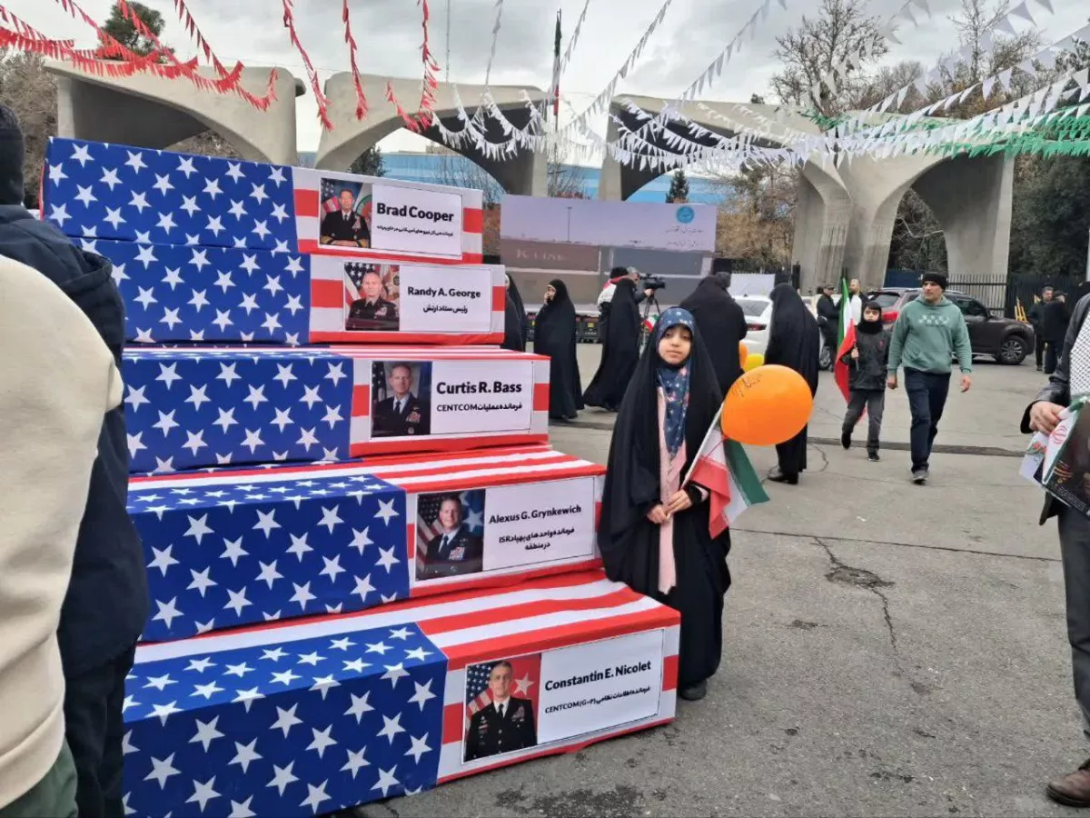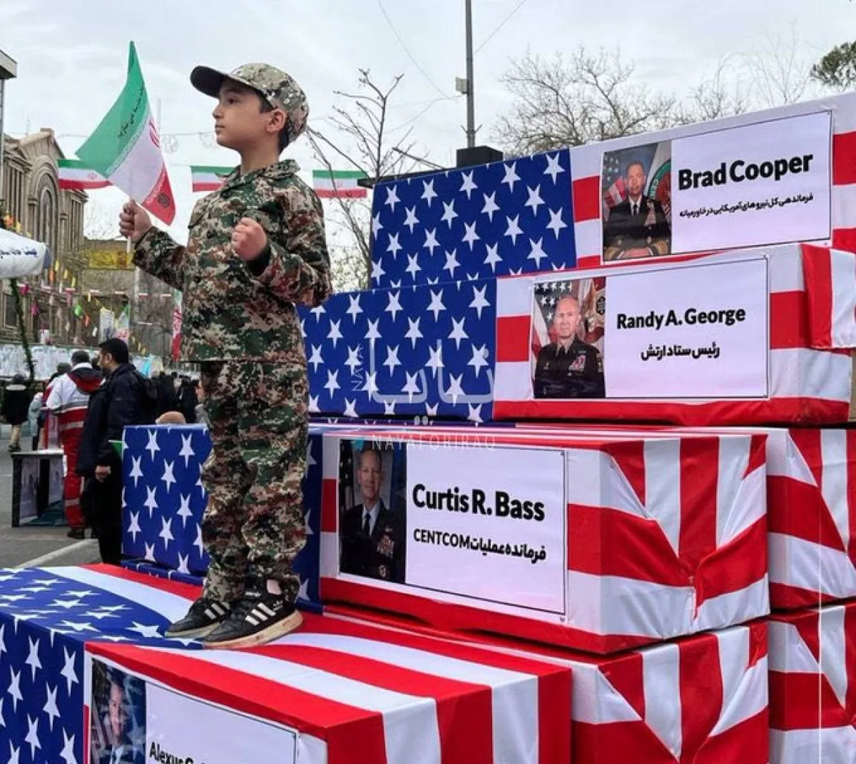 Иранские СМИ опубликовали фотографии с организованного правительством митинга в память о 22 павших в Бахмане в Тегеране, на которых видны гробы, накрытые американскими флагами, с именами и фотографиями высокопоставленных американских военачальников.