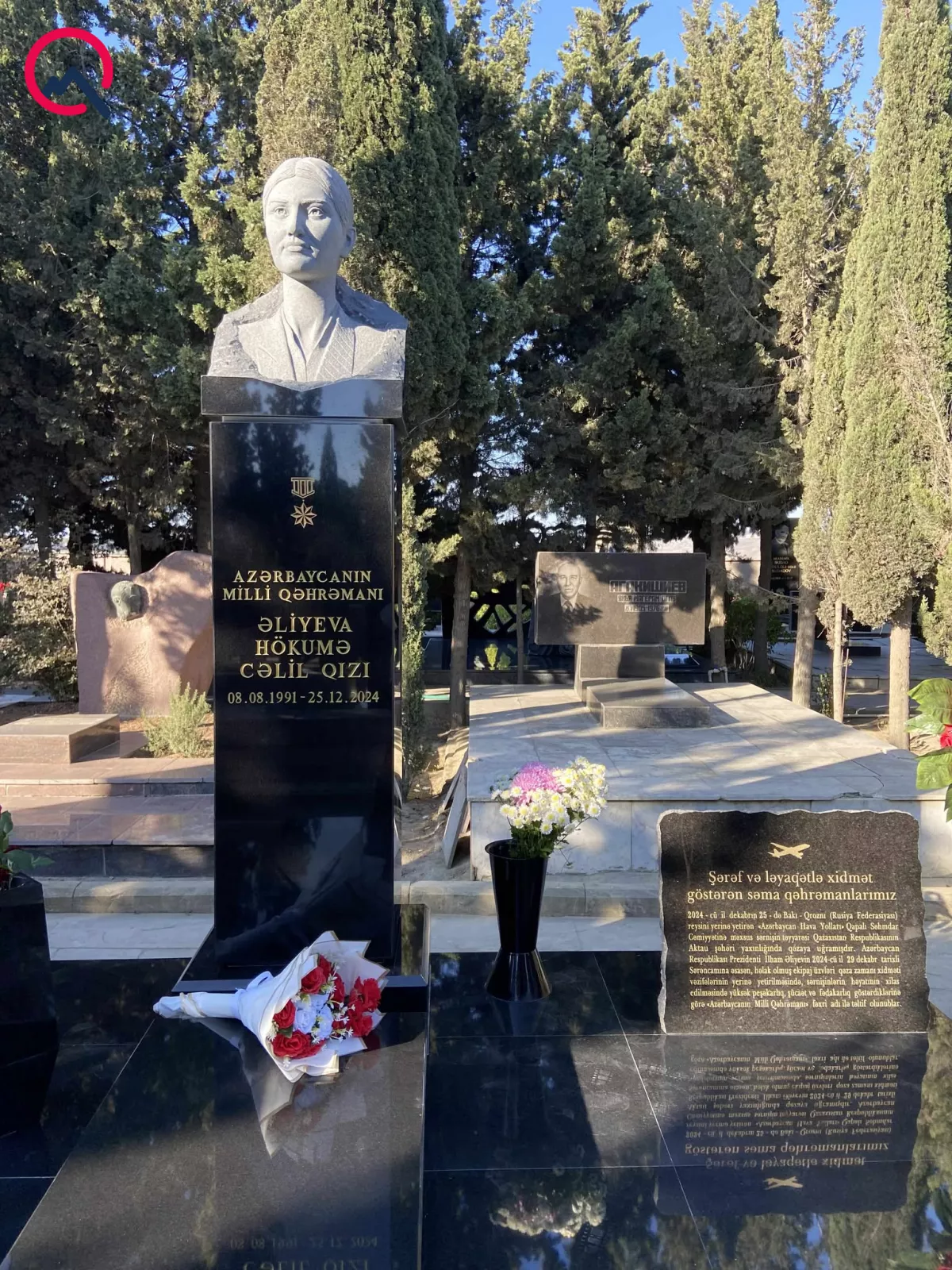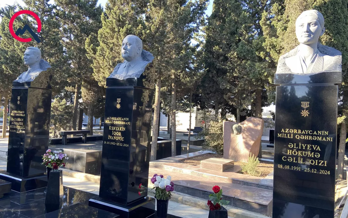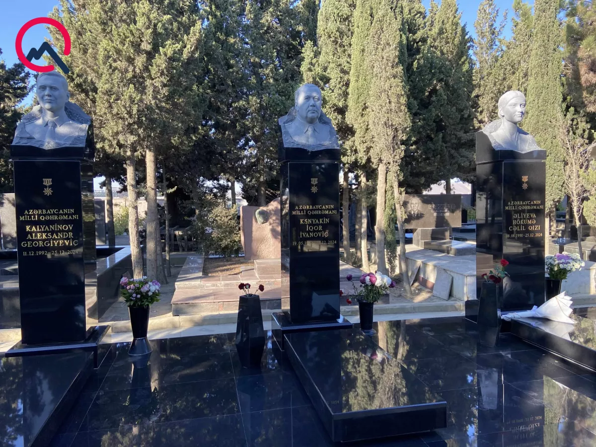 На могилах трех членов экипажа самолета AZAL - командира воздушного судна Игоря Кшнякина, пилота Александра Кальянинова и стюардессы Хокумы Алиевой, погибших в результате крушения пассажирского самолета Embraer 190, выполнявшего рейс Баку - Грозный, установлены их бюсты.