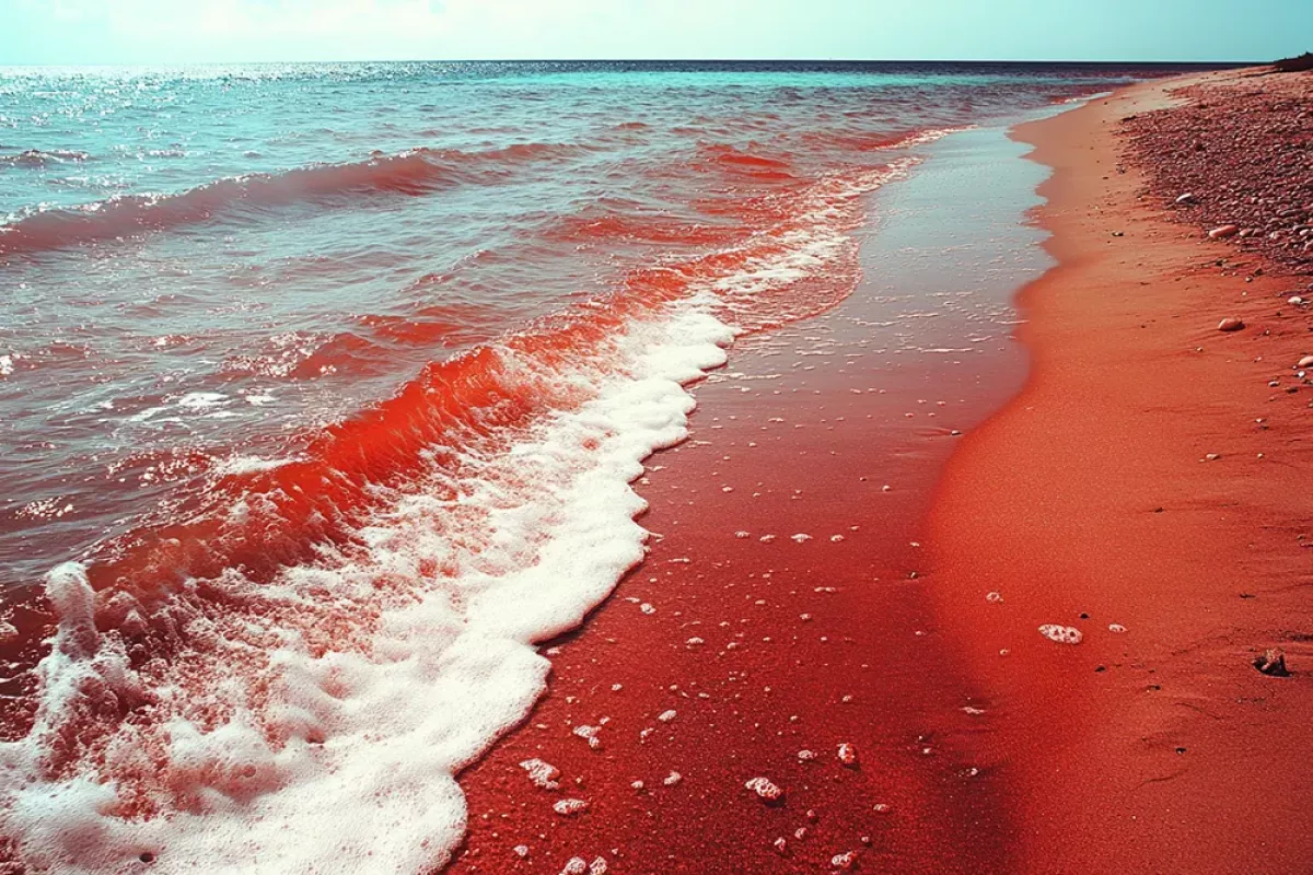 Как отмечается, это необычное природное явление вызвано высоким содержанием оксида железа в почве, который окрашивает песок и воду в ярко-красный цвет.