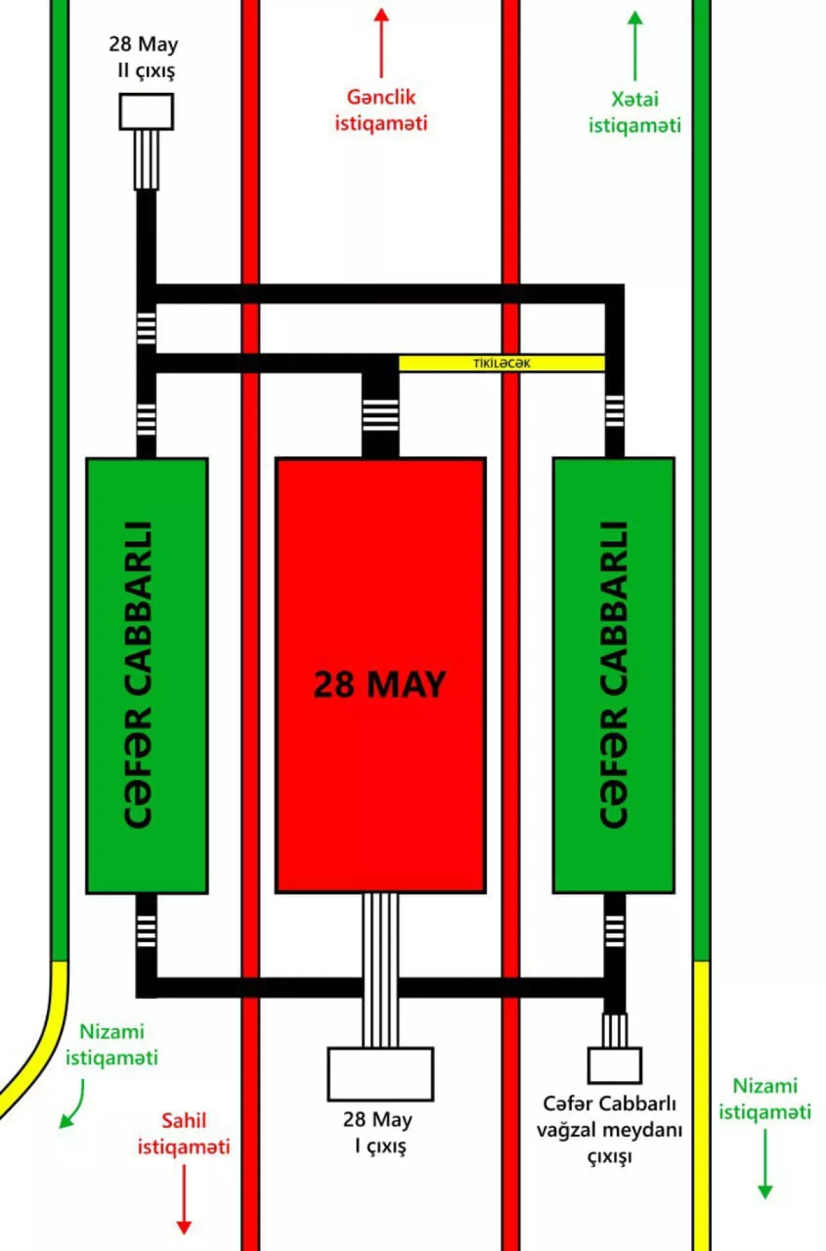 На станции метро «28 Мая» началось строительство нового входа-выхода на перрон станции «Джафар Джаббарлы» и оттуда – на площадь перед станцией метро (на поверхность).