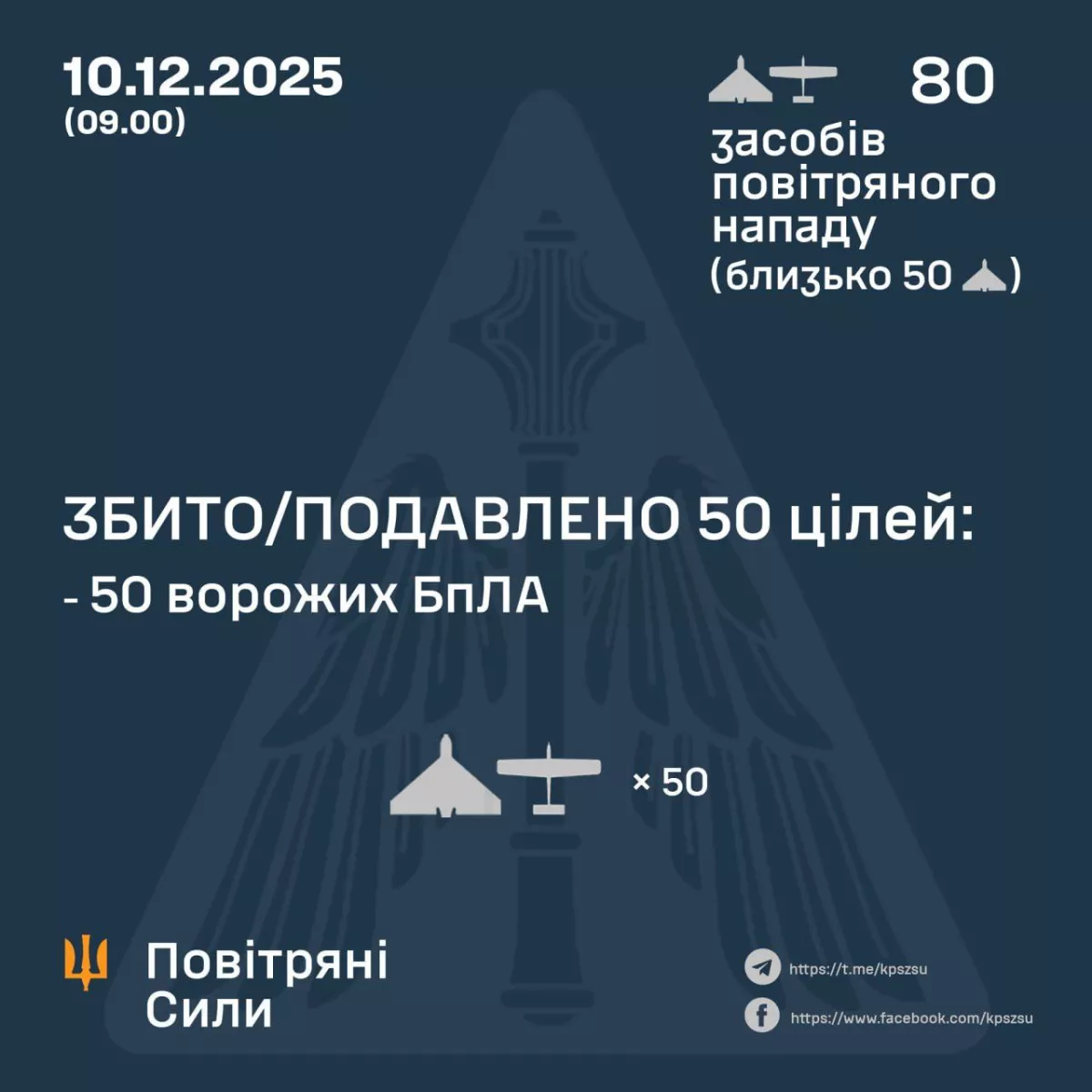 В ночь на 10 декабря Россия атаковала южные и восточные районы Украины около 80 ударными БПЛА «Шахед», «Гербера» и другими типами дронов.