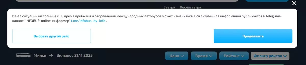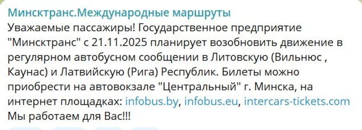 На фоне обсуждения возможного открытия границы белорусская сторона уже начала продавать билеты на автобусные маршруты в Литву. По данным Minsktrans, с 21 ноября планируется возобновление рейсов в Вильнюс, Каунас и Ригу.