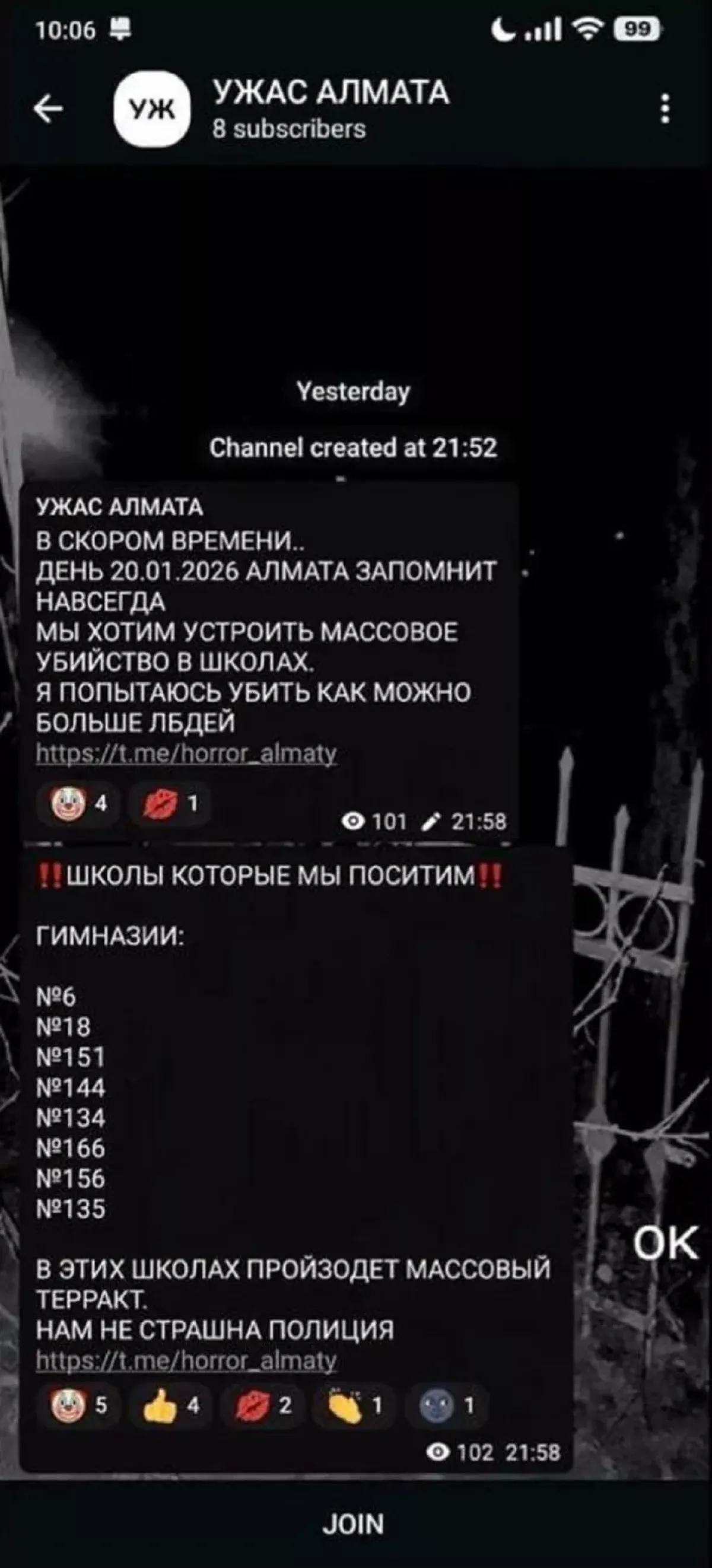 В редакцию NUR.KZ обратились обеспокоенные родители, которые рассказали, что в школьных чатах и группах рассылают скриншоты публикаций из Telegram-канала, в котором неизвестные грозятся устроить массовые теракты в школах во вторник, 20 января.
