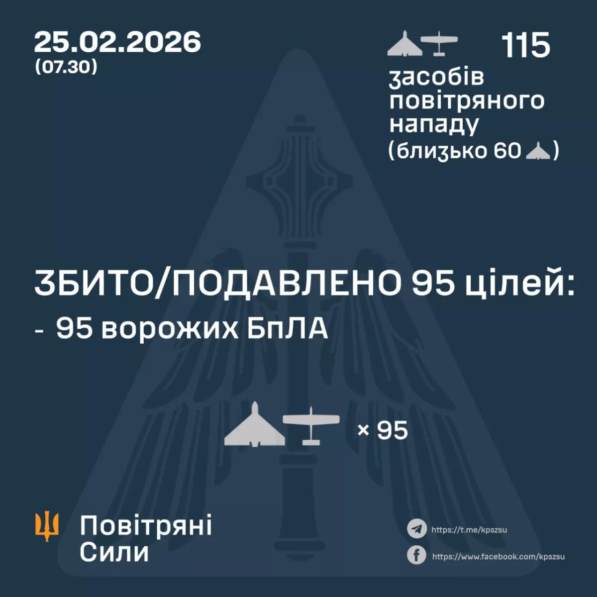 В ночь на 25 февраля Россия атаковала 115 ударными БПЛА типа «Шахед», «Гербера», «Италмас» и других. Около 60 из них — «Шахеды».